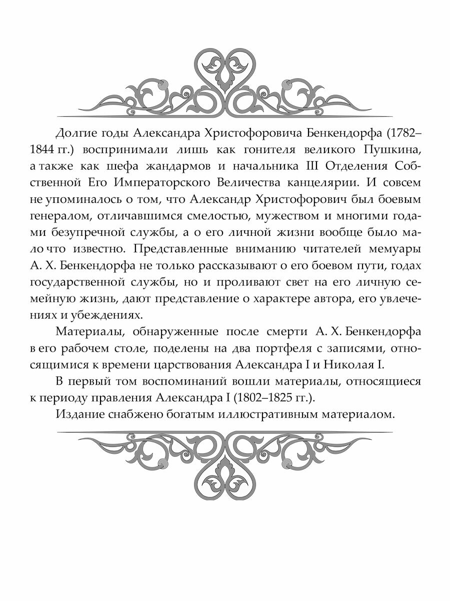 Долгие годы Александра Христофоровича Бенкендорфа (1782–1844 гг.) воспринимали лишь как гонителя великого Пушкина, а также как шефа жандармов и начальника III Отделения Собственной Его Императорского Величества канцелярии. И совсем не упоминалось о том, что Александр Христофорович был боевым генералом, отличавшимся смелостью, мужеством и многими годами безупречной службы, а о его личной жизни вообще было мало что известно. Представленные вниманию читателей мемуары А. Х. Бенкендорфа не только рассказывают о его боевом пути, годах государственной службы, но и проливают свет на его личную семейную жизнь, дают представление о характере автора, его увлечениях и убеждениях. Материалы, обнаруженные после смерти А. Х. Бенкендорфа в его рабочем столе, поделены на два портфеля с записями, относящимися к времени царствования Александра I и Николая I. В первый том воспоминаний вошли материалы, относящиеся к периоду правления Александра I (1802–1825 гг.). Издание снабжено богатым иллюстративным материалом.