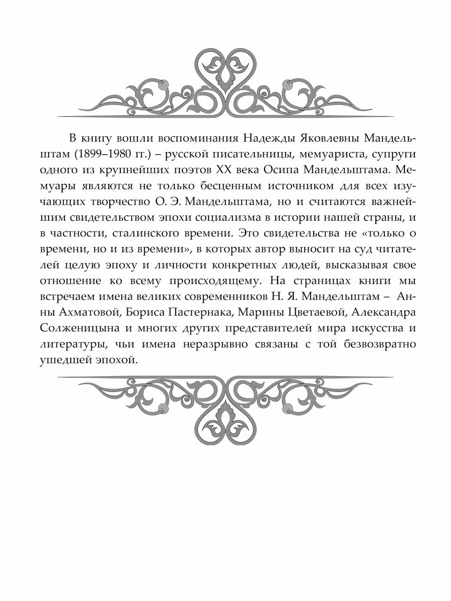 В книгу вошли воспоминания Надежды Яковлевны Мандельштам (1899-1980 гг.) - русской писательницы, мемуариста, супруги одного из крупнейших поэтов XX века Осипа Мандельштама. Мемуары являются не только бесценным источником для всех изучающих творчество О. Э. Мандельштама, но и считаются важнейшим свидетельством эпохи социализма в истории нашей страны, и в частности, сталинского времени. Это свидетельства не "только о времени, но и из времени", в которых автор выносит на суд читателей целую эпоху и личности конкретных людей, высказывая свое отношение ко всему происходящему. На страницах книги мы встречаем имена великих современников Н. Я. Мандельштам - Анны Ахматовой, Бориса Пастернака, Марины Цветаевой, Александра Солженицына и многих других представителей мира искусства и литературы, чьи имена неразрывно связаны с той безвозвратно ушедшей эпохой.