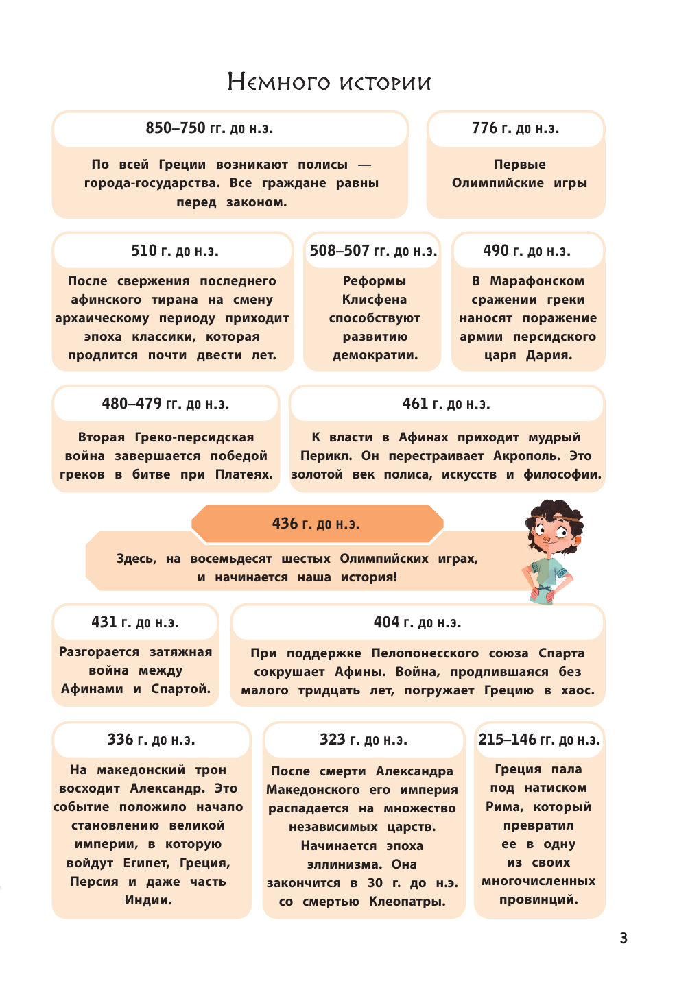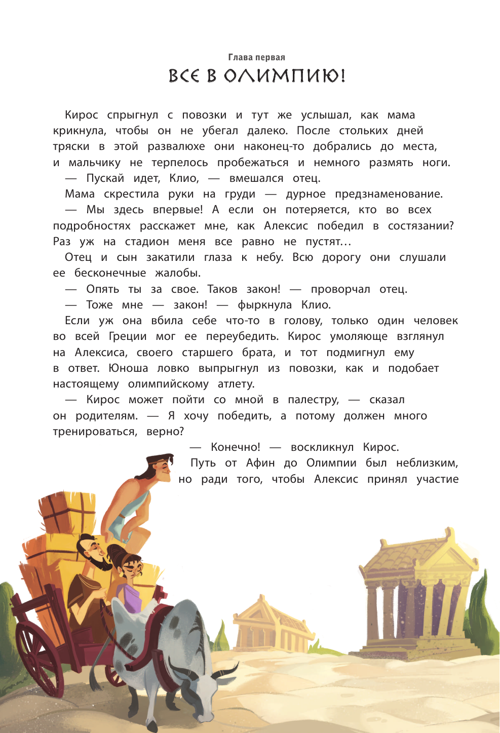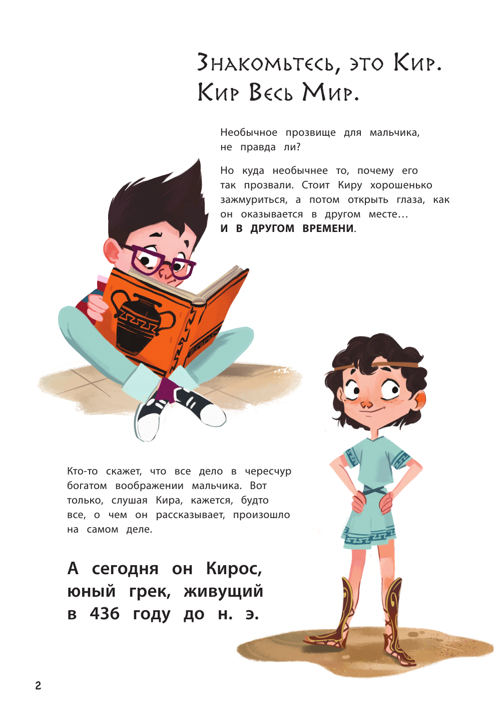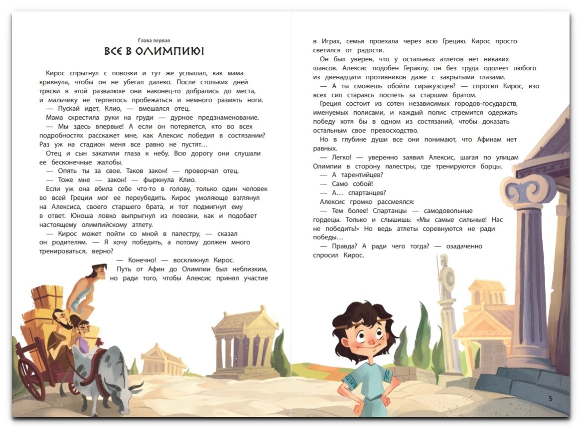 Одна из четырёх частей серии "Кир изучает мир". Небольшое по объему произведение, в котором художественный вымысел переплетается с реальной историей Древней Греции. В лёгкой непринужденной манере автор даёт нам большой объем информации о жизни, обычаях, открытиях древних греков. Несколько страниц посвящено греческим богам и героям, театру. Белая офсетная бумага, забавные иллюстрации, лёгкий слог - всё это достоинства книги. Страницы с историческими фактами обрамлены рамкой с греческим орнаментом, что придает им своеобразный колорит. Отличный вариант пробудить в ребенке интерес как к истории, так и к чтению.