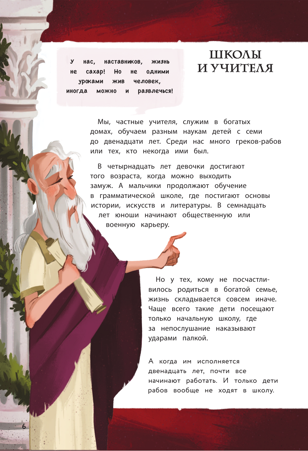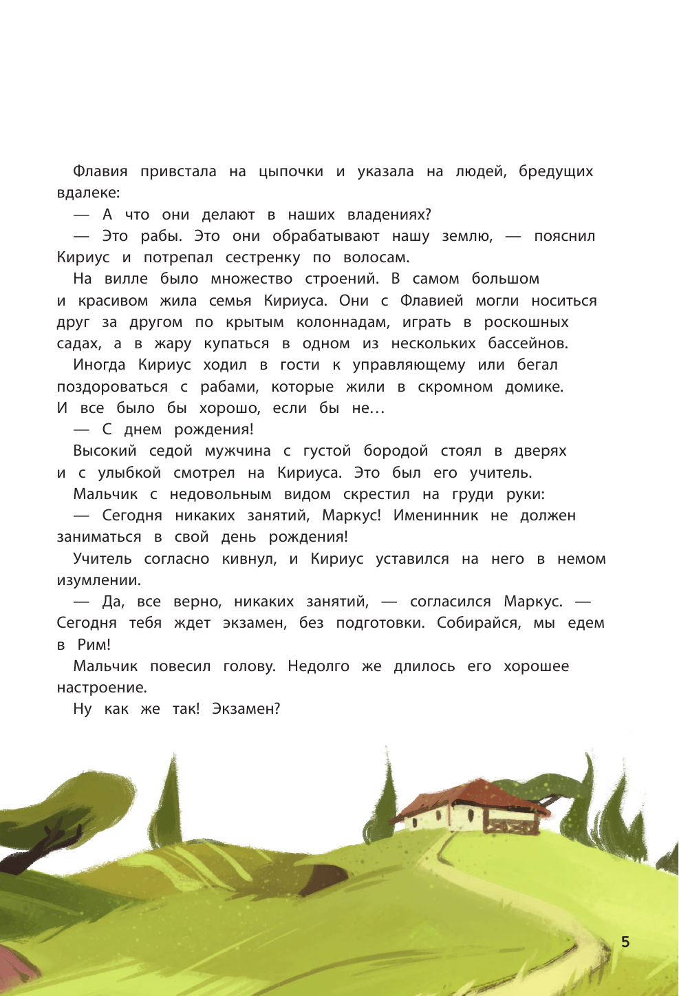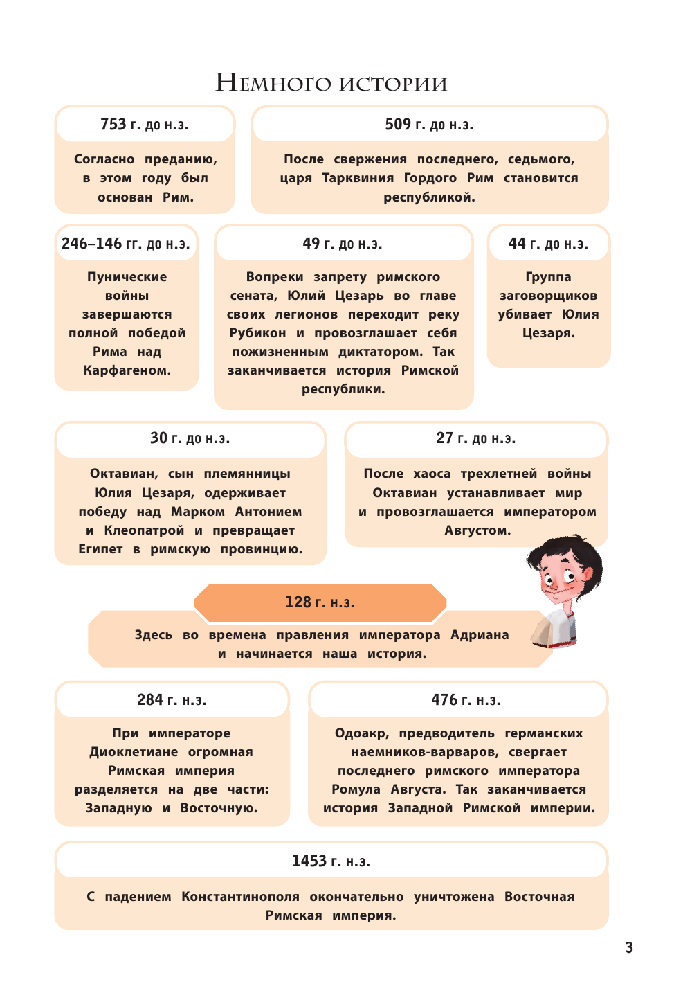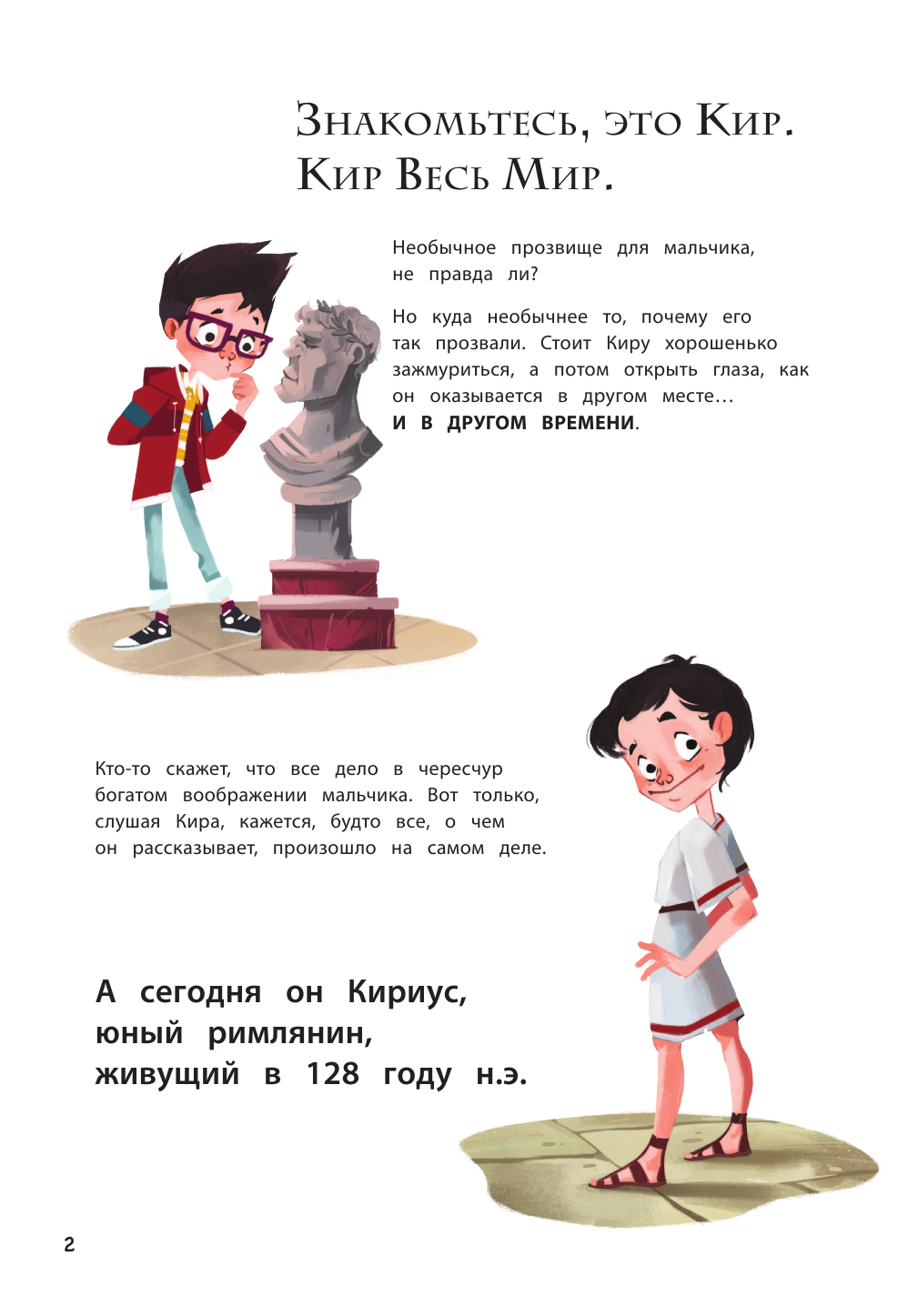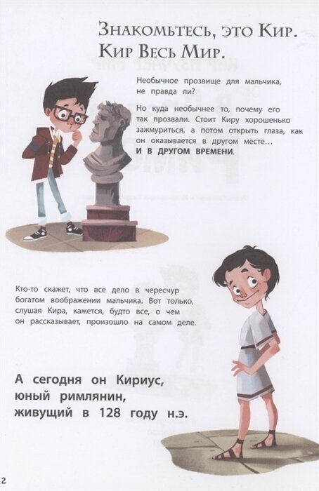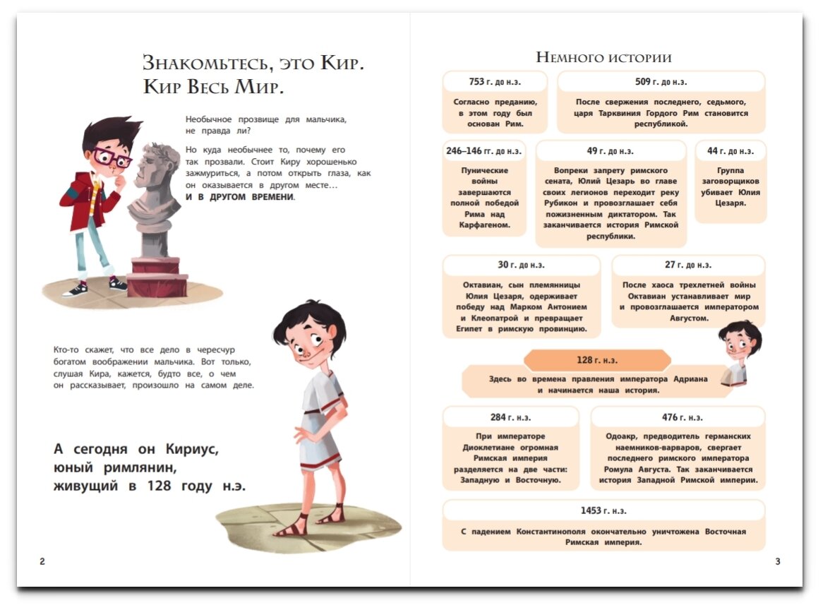 Ещё одна из четырёх частей серии "Кир изучает мир". Как и все остальные части - отличная познавательная книга. Небольшое по объему произведение, в котором художественный вымысел переплетается с реальными фактами из истории Древнего Рима. В лёгкой непринужденной манере автор даёт нам большой объем информации о жизни, обычаях, культуре, правителях Древнего Рима (история основания Рима, гладиаторские бои, школы, республика, божества). Белая офсетная бумага, забавные иллюстрации, лёгкий слог - всё это достоинства книги. Страницы с историческими фактами обрамлены рамкой в римском стиле, что придает им своеобразный колорит. Отличный вариант пробудить в ребенке интерес как к истории, так и к чтению.
