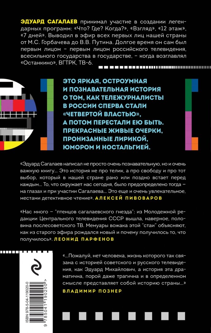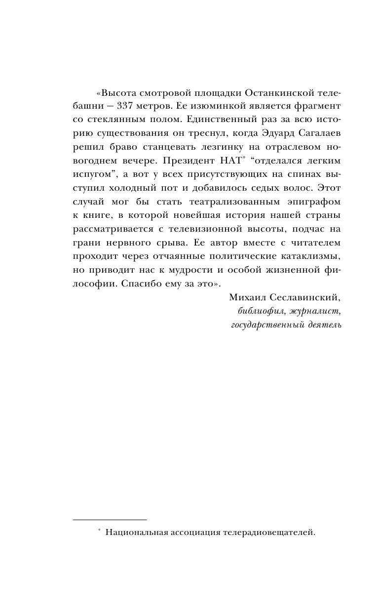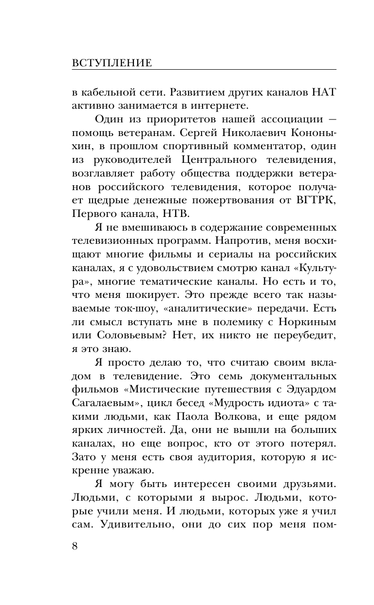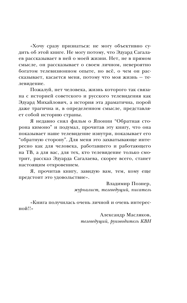 Наверное, это – лучшая книга про журналистику в России. Эдуард Михайлович подробно рисует закулисную историю того, что творилось в СМИ на заре формирования современного телевидения. Мне очень понравилось, как в книге показаны «портреты человека». Всегда интересно взглянуть на известных людей со стороны их знакомых, друзей или коллег. Пишет Сагалаев просто и откровенно.