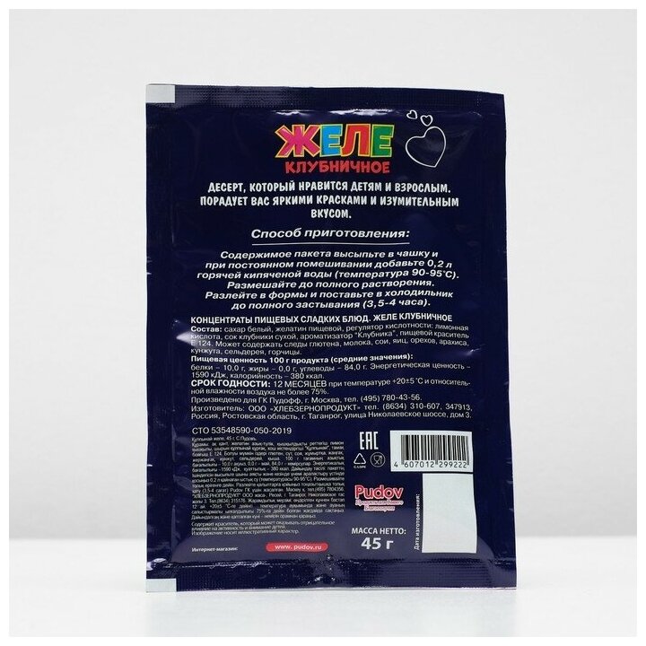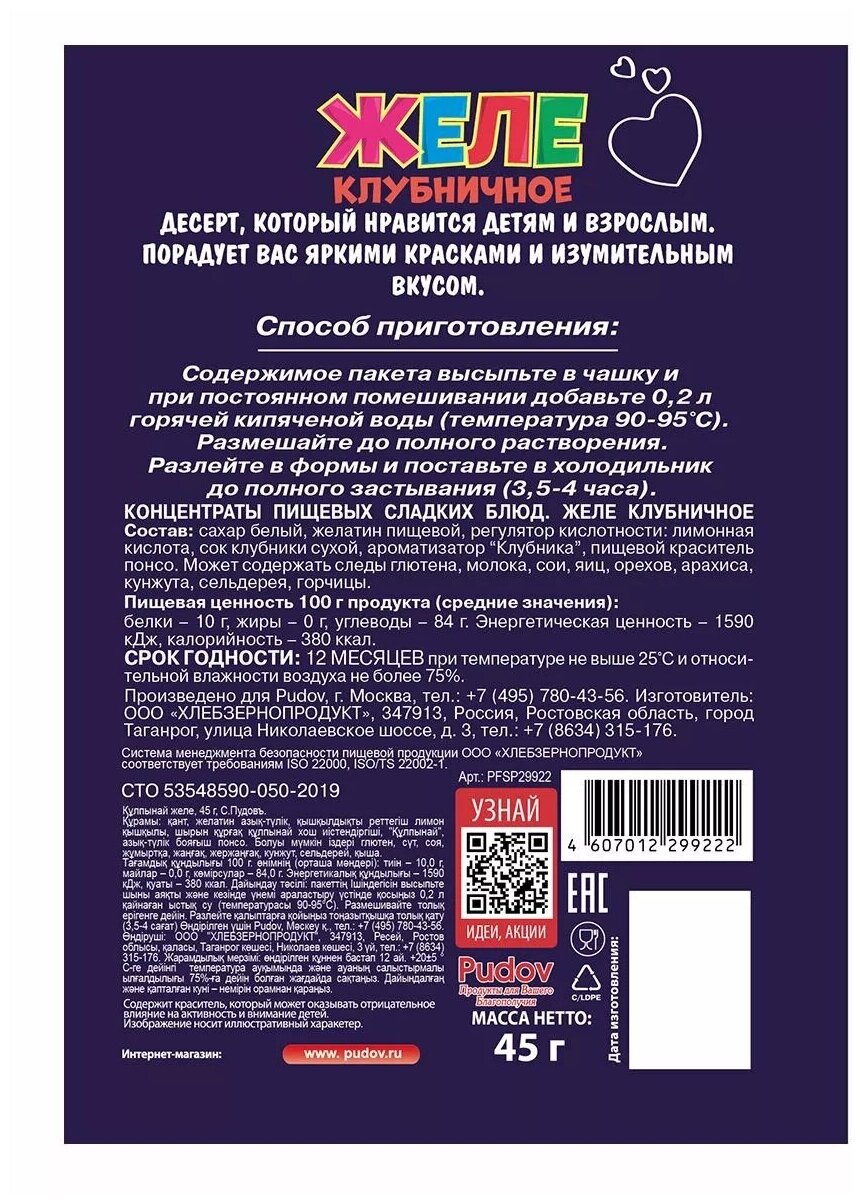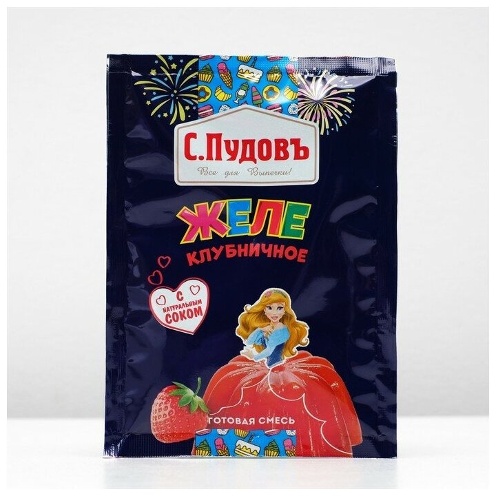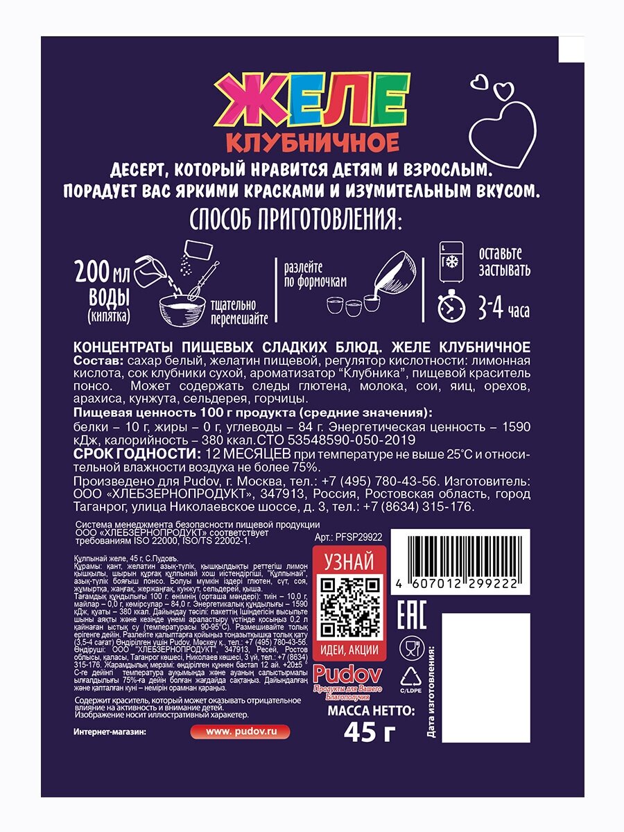 Желе клубничное – вкусный холодный десерт на основе желатина, у которого немало поклонников среди детей и взрослых. Секрет популярности – простота приготовления. А с готовой смесью желе клубничное «С. Пудовъ» справится даже ребёнок. Достаточно залить готовую смесь кипяченой водой и остудить в холодильнике.В готовую смесь мы добавили натуральный клубничный сок, так что готовый десерт получится с ярким ягодным вкусом и ароматом.Попробуйте другие вкусы желе из нашего ассортимента. А из четырёх разных видов можно приготовить популярный десерт «Радуга».Состав: сахар белый, желатин пищевой, регулятор кислотности: лимонная кислота, сок клубники сухой, ароматизатор «Клубника», пищевой краситель понсо. Может содержать следы глютена, молока, сои, яиц, орехов, арахиса, кунжута, сельдерея, горчицы.Пищевая ценность 100 г продукта: белки - 10.0 г, жиры - 0,0 г, углеводы - 84,0 г. Энергетическая ценность - 1590кДж, калорийность - 380 ккал.Срок годности: 12 месяцевХранить при температуре +20±5С и относительной влажности воздуха не более 75%.