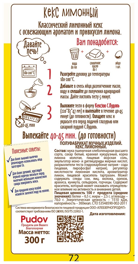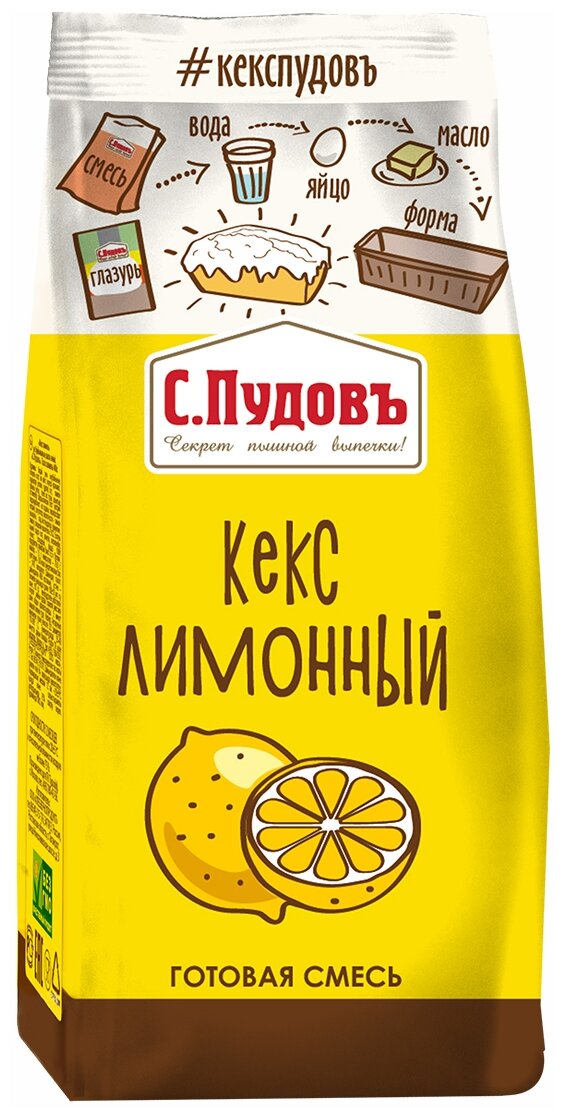 Готовая смесь для выпечки «Кекс лимонный» от «С. Пудовъ» поможет вам без лишних усилий приготовить нежный и мягкий кекс с приятным цитрусовым вкусом и ароматом лимона.Мучная смесь разработана таким образом, чтобы вам оставалось добавить в неё только воду, яйцо и масло. Тесто для кекса замешивается легко и быстро.Готовый рассыпчатый кекс с хрустящей корочкой идеально подойдёт для домашнего чаепития или скромного торжества. Для праздничной подачи кекс рекомендуется покрыть глазурью со вкусом лимона и кондитерскими посыпками «С. Пудовъ». Можно также использовать натёртую на мелкой тёрке цедру лимона.Для наилучшего результата используйте при выпекании кекса специальную форму «Кекс 300» от «С. Пудовъ». Она разработана таким образом, чтобы десерт пропекался равномерно, не терял форму и сохранил свой классический вид. Идеальная выпечка – это так просто!Вам понадобится:Вода - 80мл, сливочное масло - 70г, яйцо - 1шт.1. Разогрейте духовку до температуры 180-200С.2. Добавьте в смесь яйцо, размягченное масло, воду и смешайте до получения однородной массы. Дайте постоять тесту 5 минут.3. Выложите тесто в форму Кекс 300 С. Пудовъ (220*83*47мм) и выпекайте в течение 40-45 минут (до готовности). Охладите кекс и украсьте его перед подачей глазурью или сахарной пудрой С. Пудовъ.Состав: мука пшеничная хлебопекарная высшего сорта, сахар белый, крахмал кукурузный, корка лимона молотая, пищевая морская соль, эмульгатор моно- и диглицериды жирных кислот, разрыхлители теста (гидрокарбонат натрия - сода пищевая, пирофосфат натрия), регулятор кислотности лимонная кислота, ароматизатор лимон, пищевой краситель тартразин. Может содержать следы сои, орехов, арахиса, кунжута, сельдерея, горчицы.Пищевая ценность 100 г продукта(средние значения): белки - 6,5 г, жиры - 2,5 г, углеводы - 78,0 гЭнергетическая ценность/калорийность - 1510 кДж/360 ккал.Срок годности: 12 месяцев при температуре +20±5 °С и относительной влажности не более 75 %.
