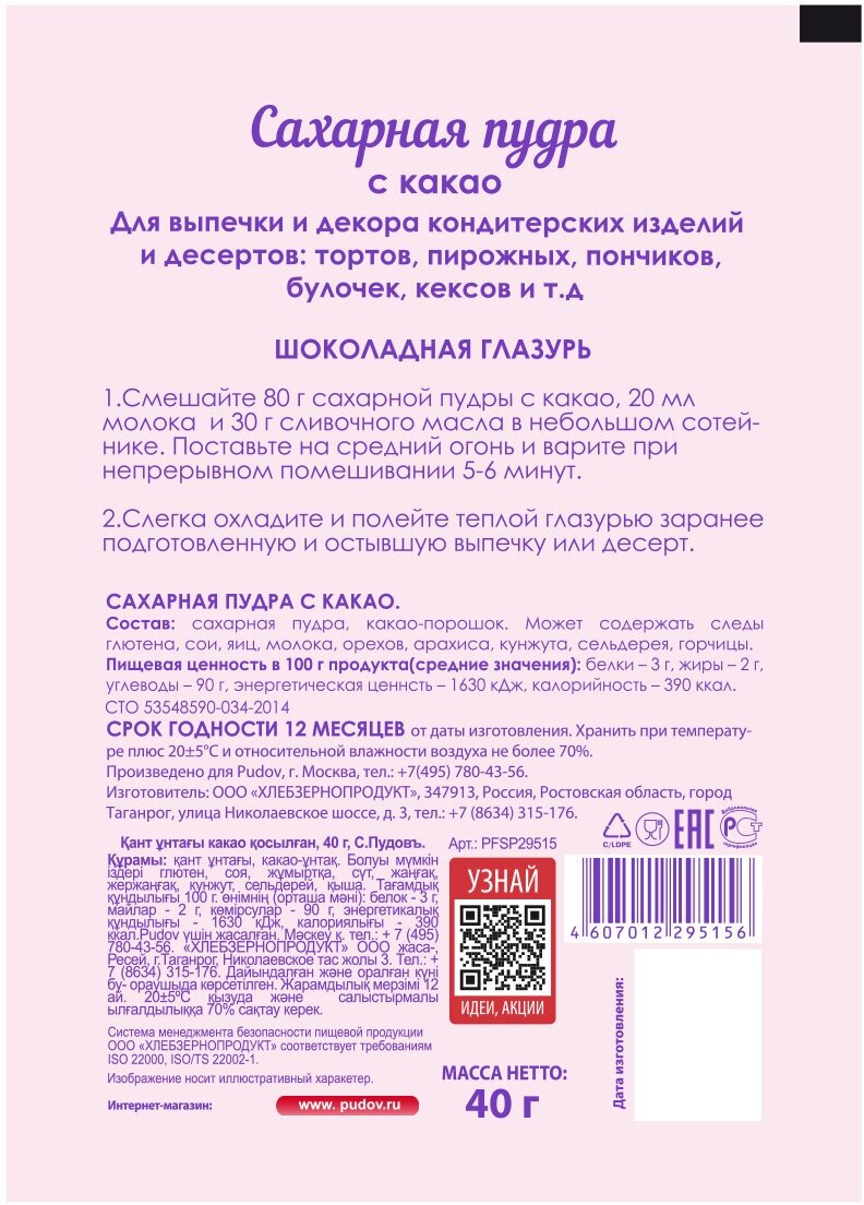 Сахарная пудра с какао С.Пудовъ - один из самых простых, но эффектных способов украсить выпечку и другие десерты. Тонкий аромат, едва уловимые нотки шоколада помогают расставить финальные акценты в готовом блюде.