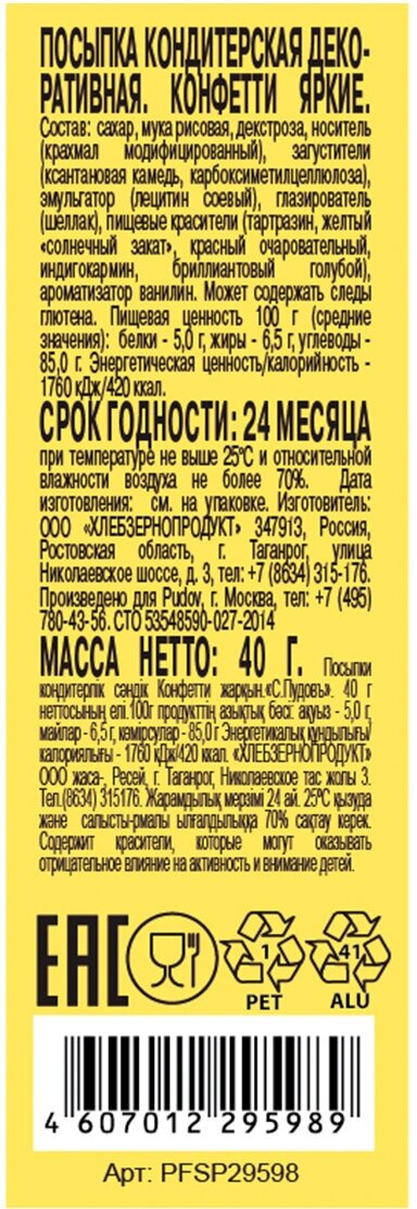 Посыпка кондитерская С.Пудовъ Конфети яркие 40г