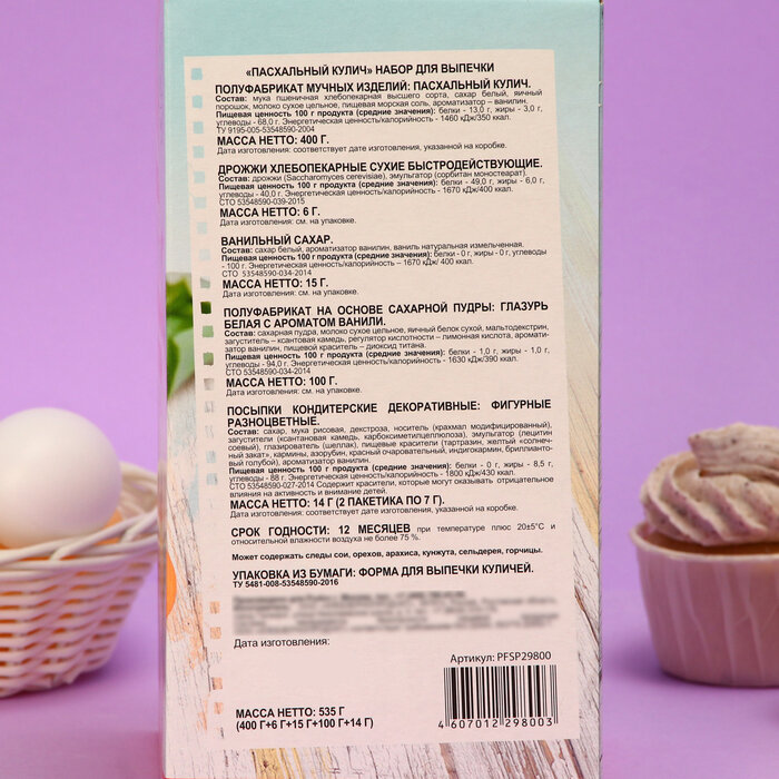 Состав набора: готовая мучная смесь «Пасхальный кулич» 400 г, дрожжи хлебопекарные сухие 6 г, ванильный сахар 1.5 г, глазурь белая с ароматом ванили 100 г, посыпки кондитерские 2 шт. по 7 г, формы бумажные для выпечки куличей 2 шт.