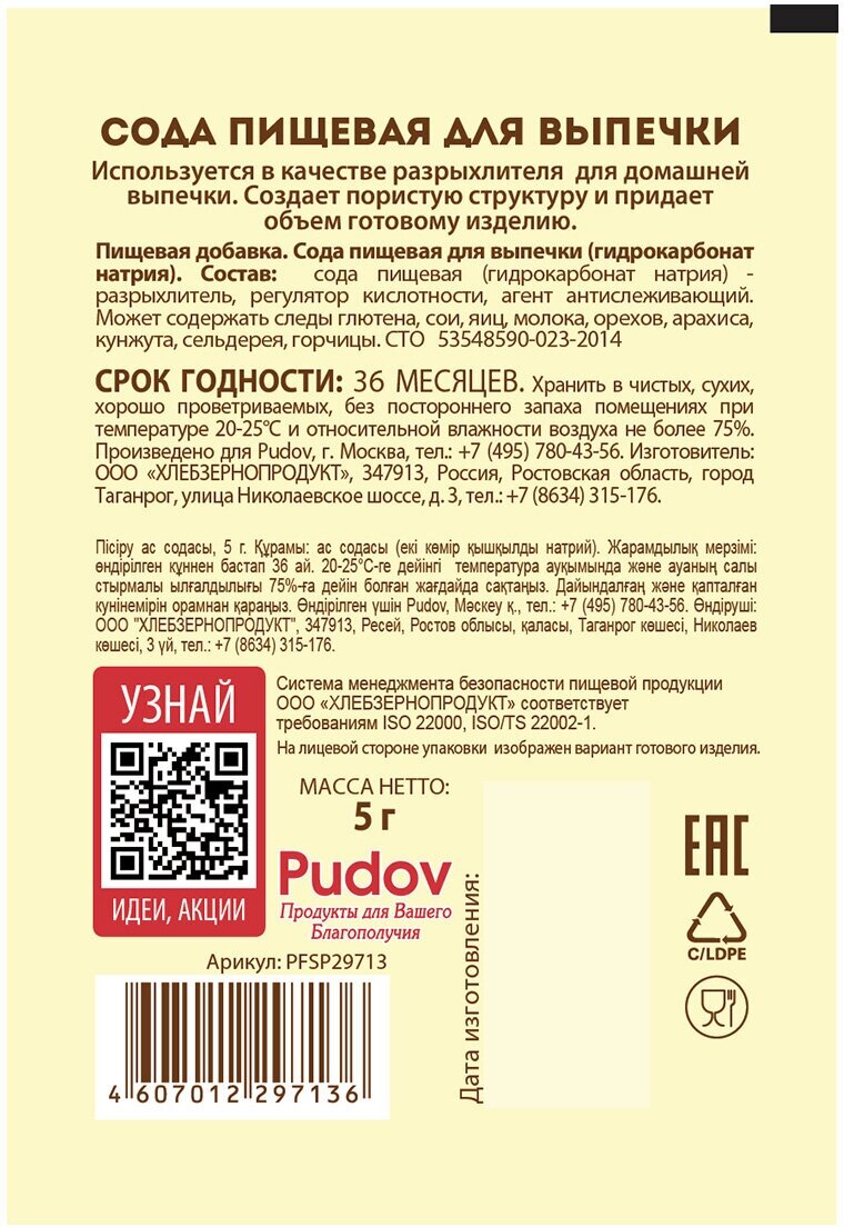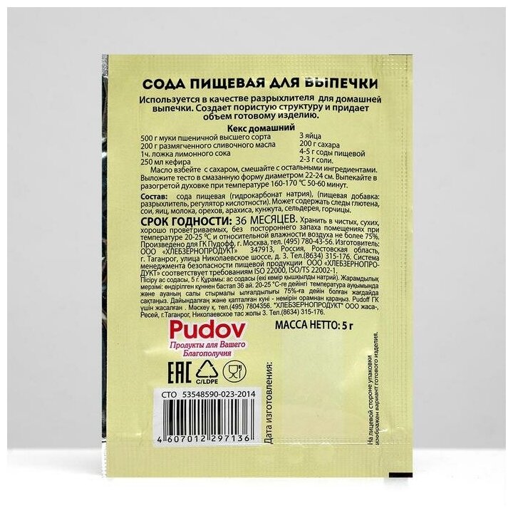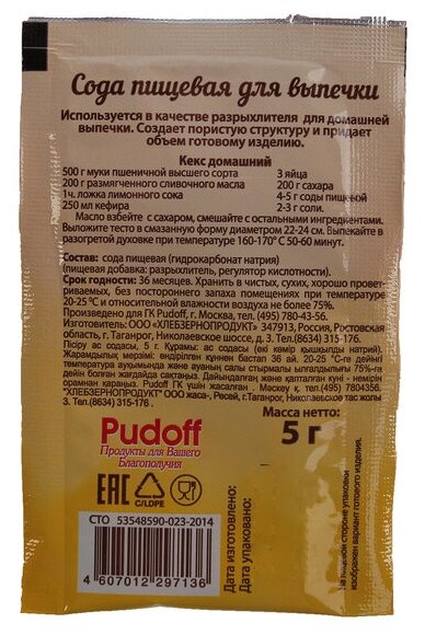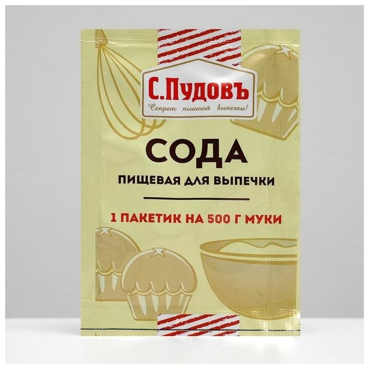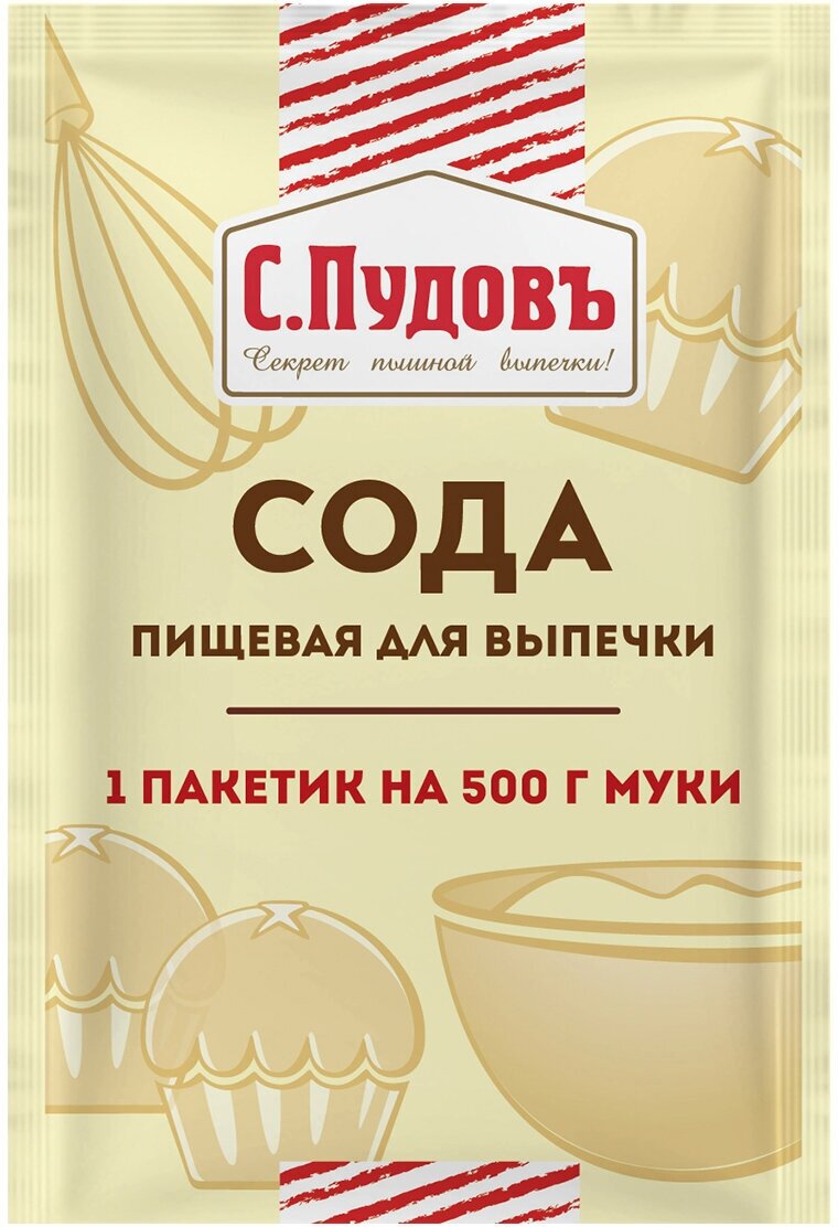 Пищевая сода для выпечки «С. Пудовъ» – это не просто универсальный, но и незаменимый продукт на кухне любой хозяйки. Она используется в качестве разрыхлителя в выпечке и отлично справляется со своей задачей. Готовые изделия получаются воздушными и пористыми. Пакетированную пищевую соду «С. Пудовъ» легко дозировать – 1 пакетик на 500 грамм муки. В такой пропорции торты, печенья, оладьи и другая любимая выпечка получатся по вкусу и текстуру такой, как вы задумывали – идеальной! Рекомендуемая дозировка: 4-5 г соды на 500 г муки. Продукция изготовлена по СТО 53548590-023-2014. Соответствует всем нормативным документам.Состав: сода пищевая (гидрокарбонат натрия) - разрыхлитель, регулятор кислотности, агент антислеживающий. Может содержать следы глютена, сои, яиц, молока, орехов, арахиса, кунжута, горчицы.Срок годности: 36 месяцев, хранить в чистых, сухих, хорошо проветриваемых, без постороннего запаха помещениях при температуре 20-25С и относительной влажности воздуха не более 75%.