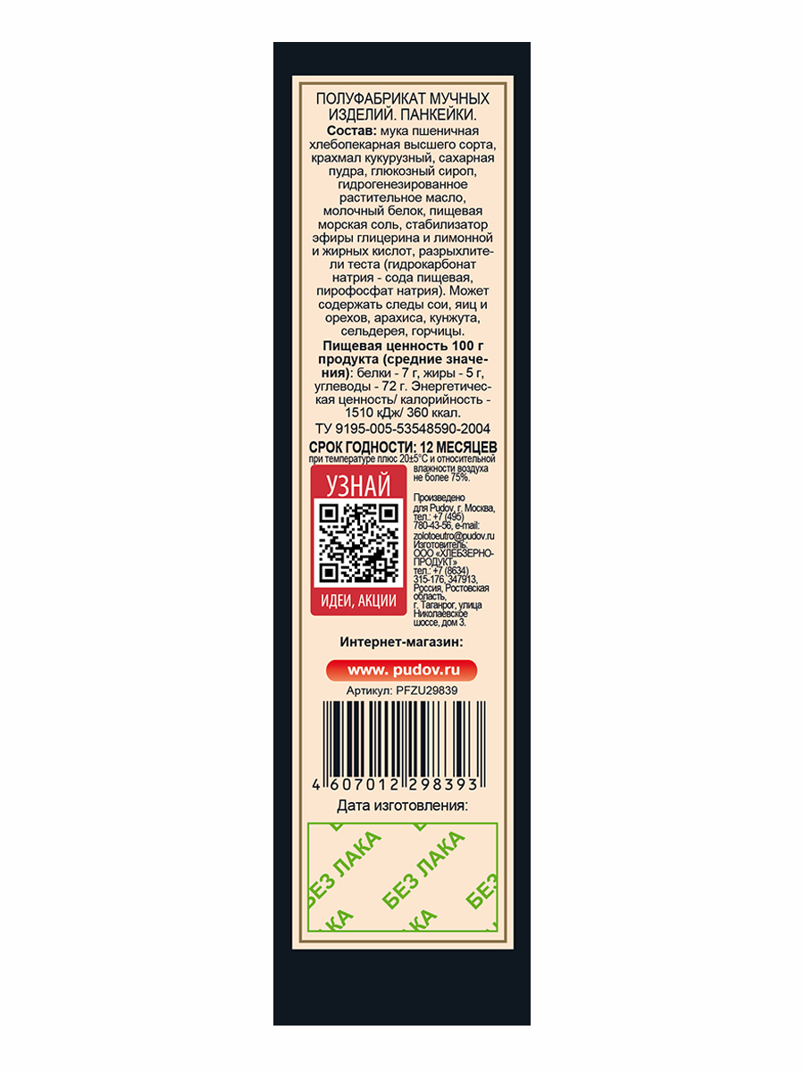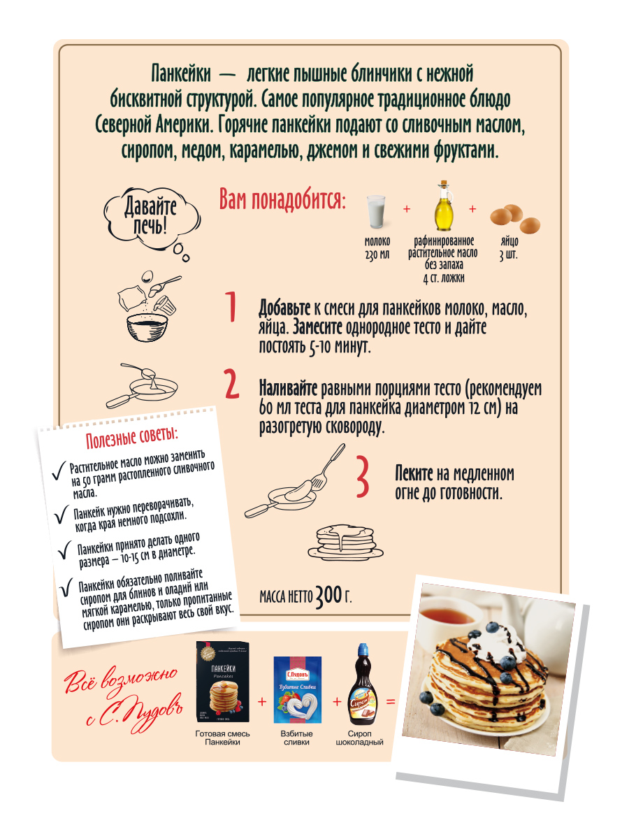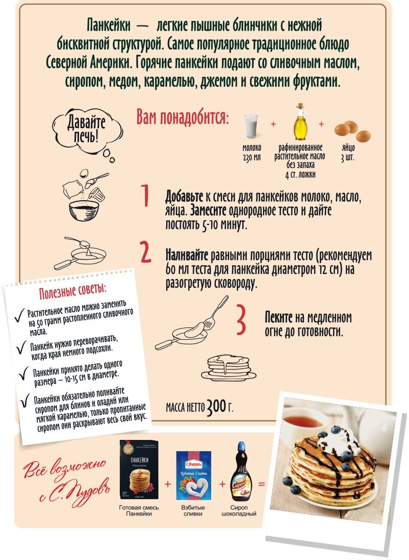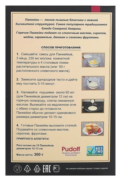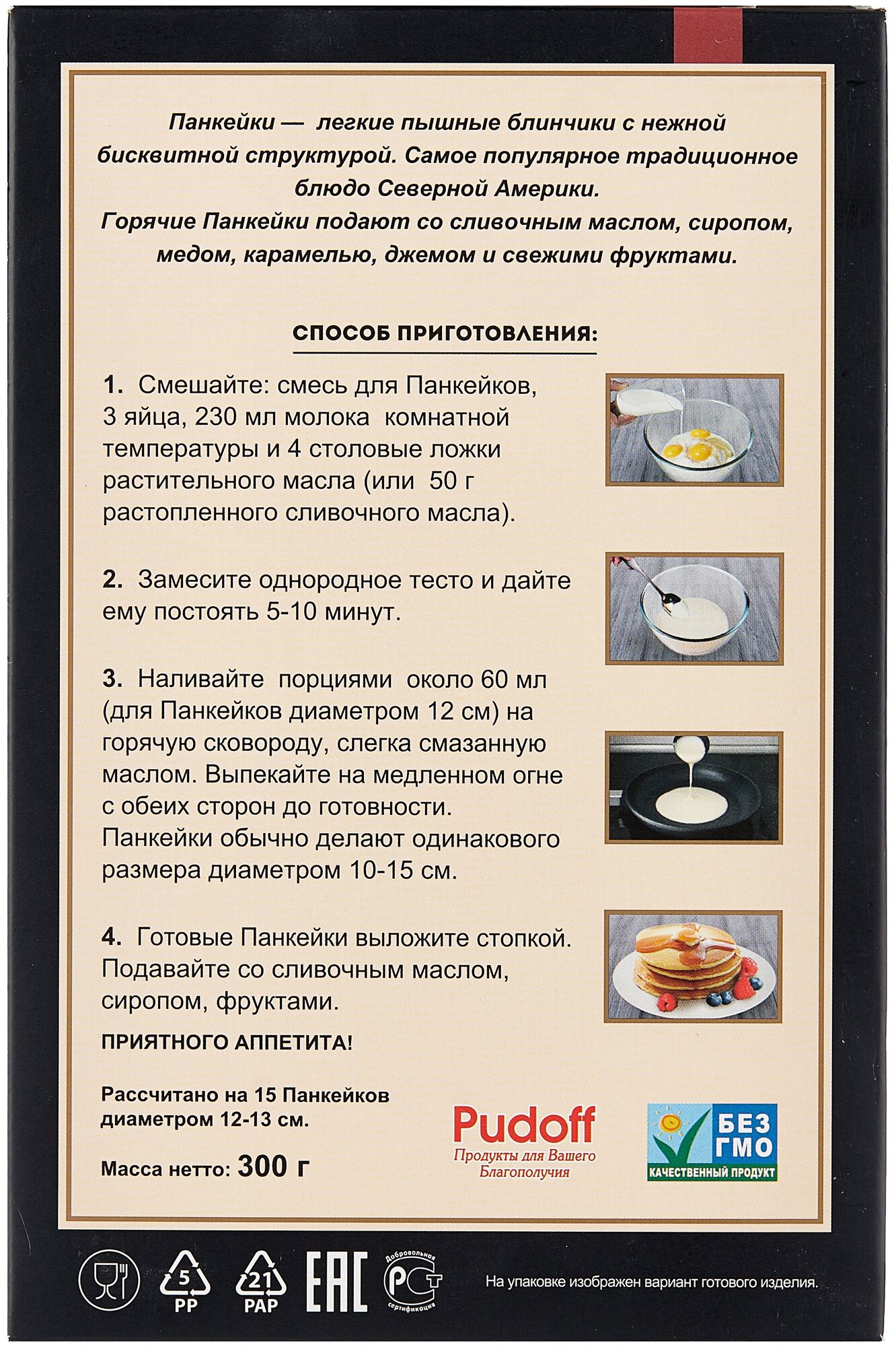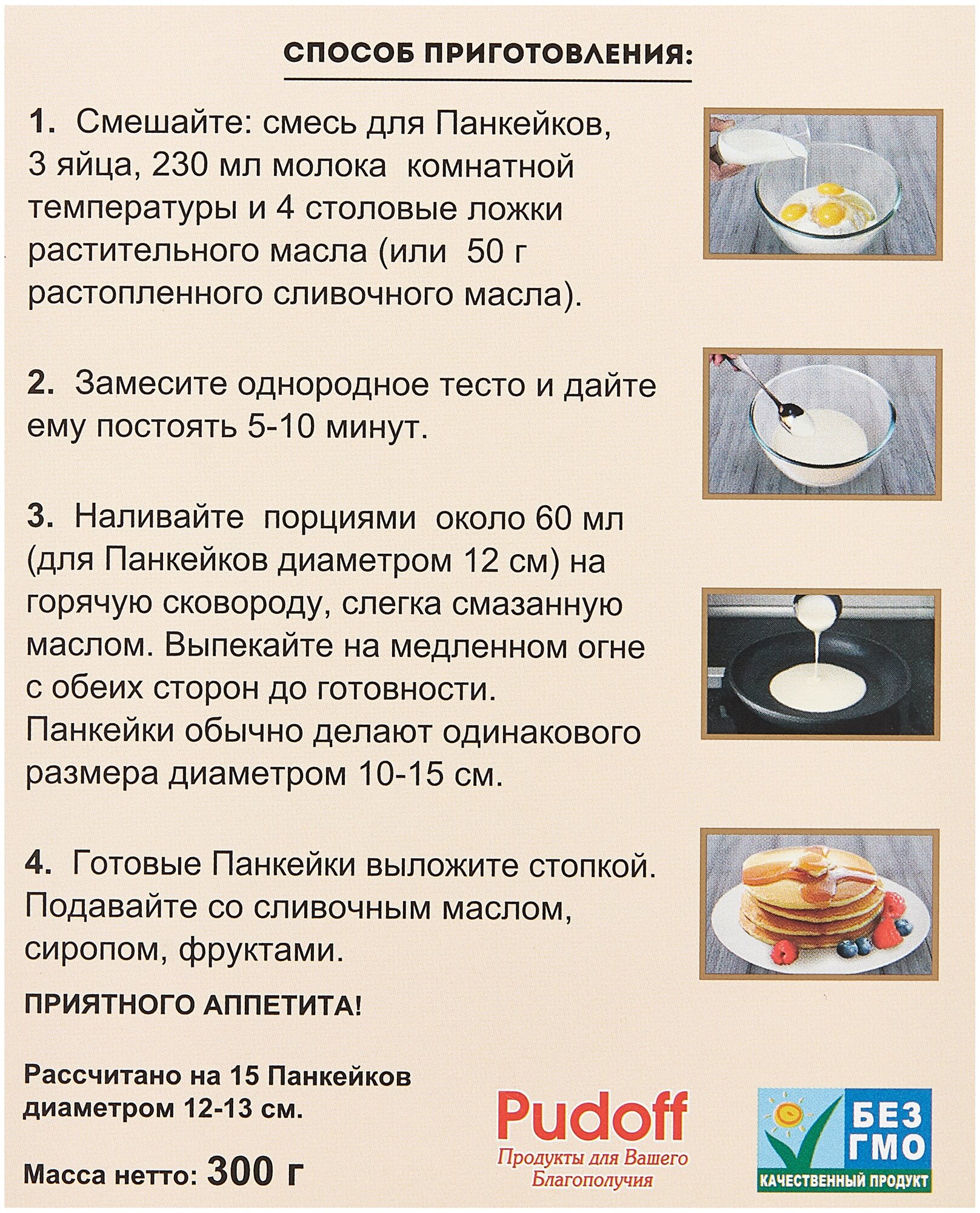 Описание товара:Готовая смесь для панкейков Золотое утро 300 г. Полуфабрикат мучных изделий. Вкусный завтрак - отдельный праздник в жизни! Панкейки — легкие пышные блинчики с нежной бисквитной структурой. Самое популярное традиционное блюдо Северной Америки. Горячие Панкейки подают со сливочным маслом, сиропом, медом, карамелью, джемом и свежими фруктами. Рассчитано на 15 Панкейков диаметром 12-13 см. ТУ 9195-005-53548590-2004 Без ГМО.Состав товара:Мука пшеничная хлебопекарная высшего сорта, крахмал кукурузный, сахарная пудра, глюкозный сироп, гидрогенезированное растительное масло, молочный белок, стабилизатор Е472а, регулятор кислотности - лимонная кислота, разрыхлитель — гидрокарбонат натрия (сода пищевая), пищевая поваренная морская соль.Способ приготовления:Смешайте: смесь для Панкейков, 3 яйца, 230 мл молока комнатной температуры и 4 столовые ложки растительного масла (или 50 г растопленного сливочного масла). Замесите однородное тесто и дайте ему постоять 5-10 минут. Наливайте порциями около 60 мл (для Панкейков диаметром 12 см) на горячую сковороду, слегка смазанную маслом. Выпекайте на медленном огне с обеих сторон до готовности. Панкейки обычно делают одинакового размера диаметром 10-15 см. Готовые Панкейки выложите стопкой. Подавайте со сливочным маслом, сиропом, фруктами. ПРИЯТНОГО АППЕТИТА!Меры предосторожности:Может содержать следы сои, яиц и орехов. Хранить при относительной влажности воздуха не более 75%.