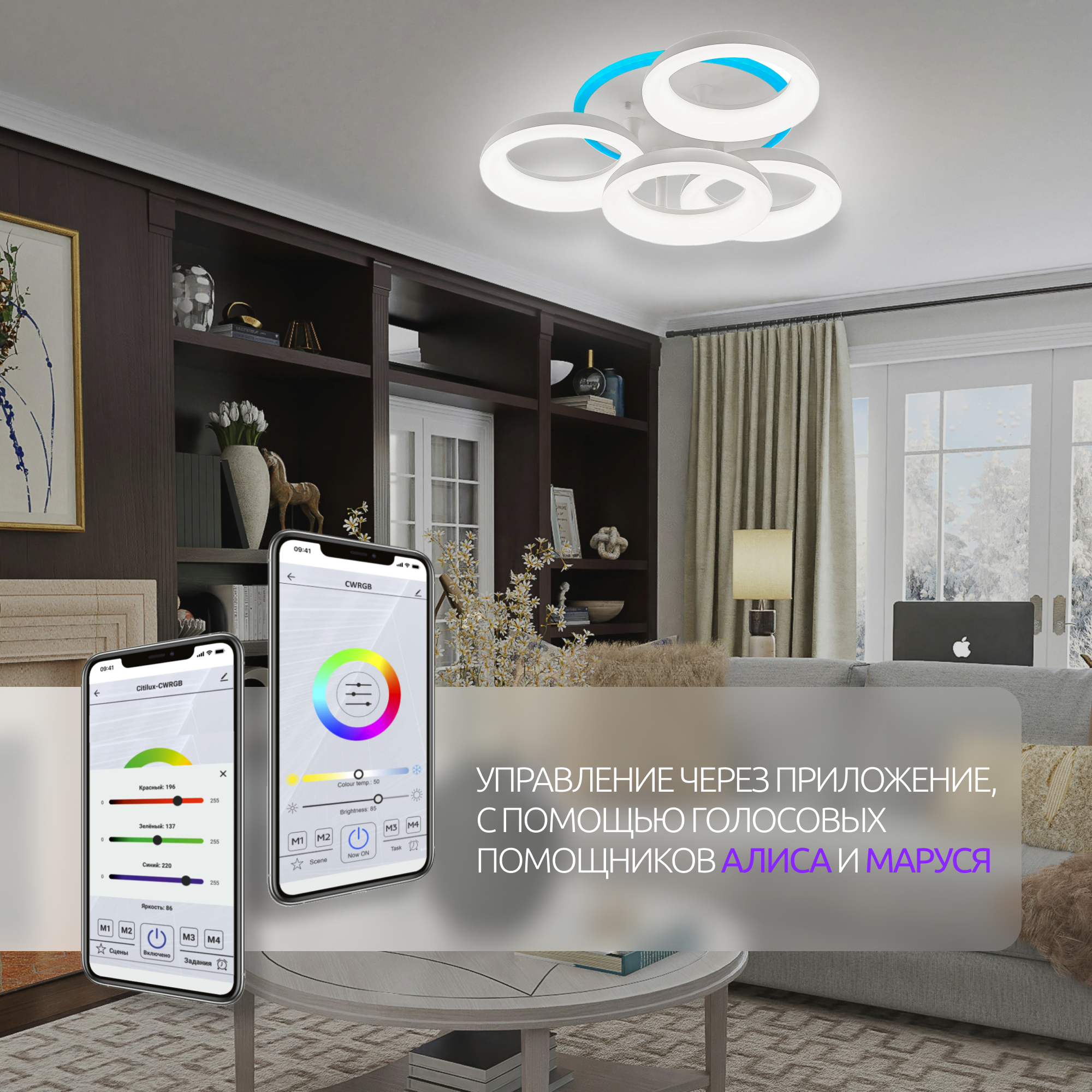 | Дополнительные характеристики | можно управлятьиз приложения на смартфоне по Wi-Fi при наличии интернета, с помощью голосовых помощников Алиса и Маруся, есть возможность запуска настроенных сценариев с помощью Сири, а также пультом дистанционного управления и с настенного выключателя; в основании светильника установлена независимая цветная подсветка RGB.; пульт ДУ с батарейками (тип ААА) в комплекте |