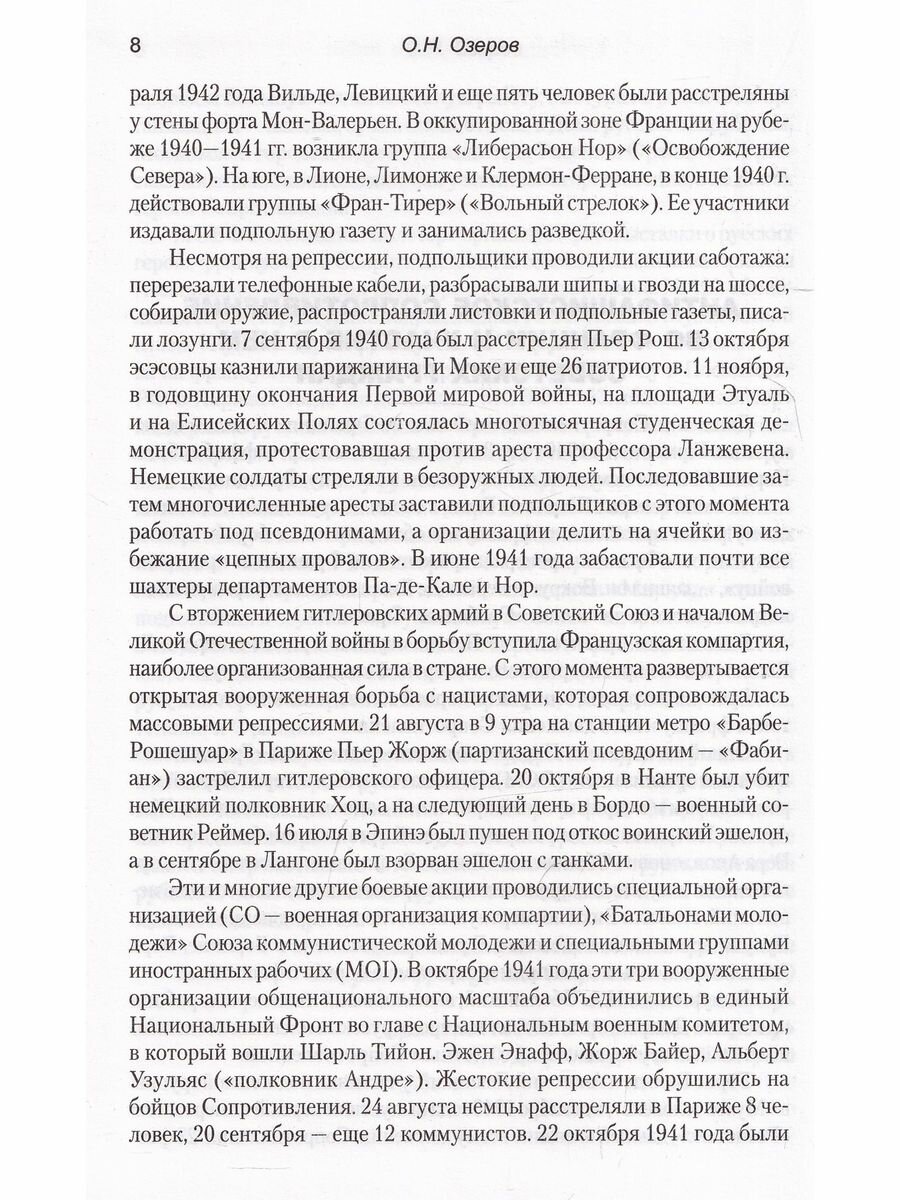 Начнем с имени автора на обложке. Олег Николаевич Озеров (1922–2007) был одним из многочисленных советских солдат, попавших во время тяжелых боев 41 г. в немецкий плен. Не сдался, сумел бежать, оказался в одном из французских партизанских отрядов. Как бывший советский боец-волонтер был удостоен высших французских наград (включая орден Почетного легиона). В 1993 г. создал Ассоциацию участников Сопротивления и смог многого добиться от властей. Его главной задачей было увековечивание памяти погибших и восстановление справедливости в отношении живущих – бывших участников французского Сопротивления, лишенных права считаться ветеранами Великой Отечественной войны.