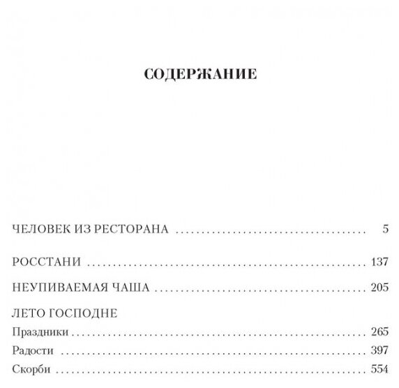 По отзывам современников, Иван Шмелев стал «самым русским» из эмигрантских писателей, который выговорил о России всю «глубинную правду», создав ее очищенный от случайностей, прекрасный и светлый образ, одухотворенный высшим смыслом и верой. Выйдя за рамки национальной литературы, творчество Шмелева обрело общечеловеческое значение; его произведения получили европейскую известность и были переведены на десятки языков. Писатель дважды номинировался на Нобелевскую премию по литературе. В настоящее издание вошли наиболее известные произведения Ивана Шмелева, которые представляют разные грани его творчества: повести «Человек из ресторана», «Росстани», «Неупиваемая Чаша» и роман «Лето Господне».