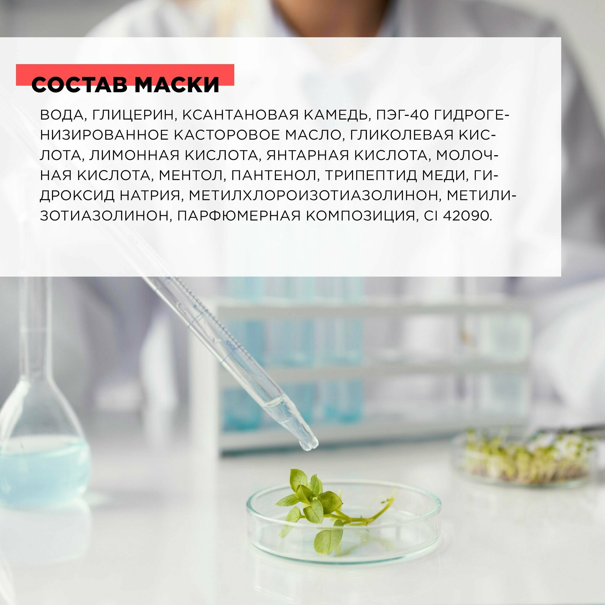 Состав | вода, глицерин, ксантановая камедь, пэг-40 гидрогенизированное касторовое масло, гликолевая кислота, лимонная кислота, янтарная кислота, молочная кислота, ментол, пантенол, трипептид меди, гидроксид натрия, метилхлороизотиазолинон, метилизотиазолинон, парфюмерная композиция, ci 42090 |