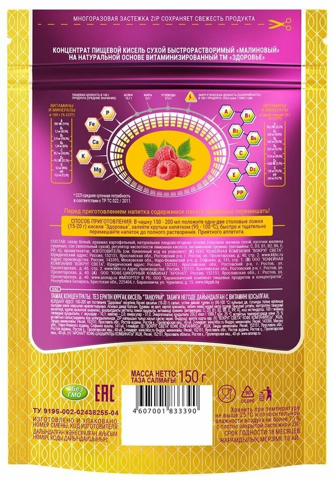 Кисель Здоровье малиновый 150 г произведен ООО "Кофейная компания "Вокруг Света" в соответствии со стандартом качества ТУ 9195-002-02438255-04. Вам останется только соблюсти условия хранения и наслаждаться вкусом и пользой этого невероятного продукта, гарантировано улучшающего ваше самочувствие.