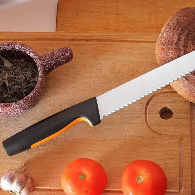 Для тех, кто ценит продуманные, но в то же время простые в уходе кухонные инструменты, нож для хлеба Fiskars Functional Form станет универсальным, повседневным помощником. Длинное, серрейторное лезвие ножа из прочной нержавеющей японской стали отлично подходит для нарезки хлеба с хрустящей корочкой. Эргономичная ручка ножа имеет нескользящее покрытие SoftGrip, а упор для пальцев обеспечит безопасность во время работы. Как и все ножи Functional Form, этот нож можно мыть в посудомоечной машине, а его тонкий профиль упрощает хранение. Разработано в Финляндии.