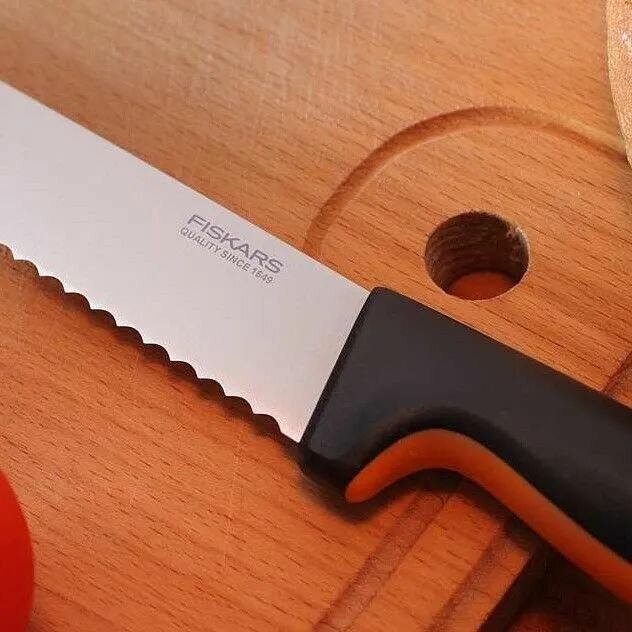Ніж для хліба Fiskars FF 21 см - зручний та практичний, ідеально підходить для нарізання хліба з хрусткою скоринкою. Він має довге зубчасте лезо з міцної японської нержавіючої сталі, для легкого та швидкого нарізання. Ергономічна ручка з покриттям SoftGrip забезпечує комфортне використання ножа, а спеціальний упор для пальців гарантує безпеку під час роботи. Ніж можна мити в посудомийній машині, що робить його простим у догляді. Можу сміливо рекомендувати усім, хто шукає якісний та функціональний ніж для щоденного використання на кухні. #відеорозпакуванняmoyo