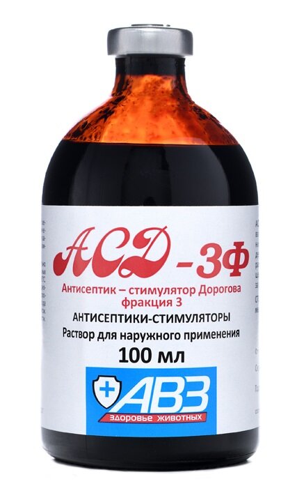 "Антисептик-стимулятор Дорогова фракция 3" ("АСД-3Ф") назначают животным для лечения инфицированных вялозаживающих ран, дерматитов, хронических воспалительных поражений кожи и копыт, трофических язв, свищей, копытной гнили овец и некробактериоза животных.