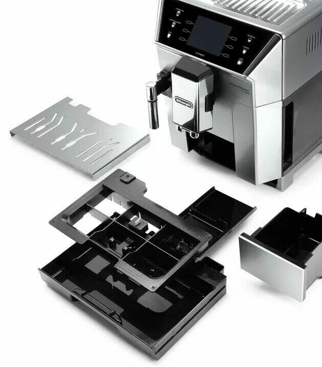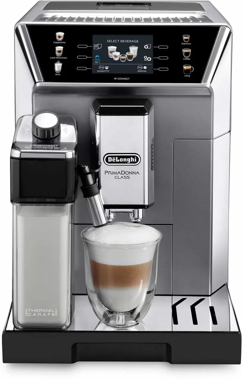 Автоматическая кофемашина DeLonghi ECAM550.85. MS – удачный выбор для большой семьи. Разнообразное «меню» позволит каждому выбрать кофе себе по вкусу, а резервуар объемом 2 л – заварить несколько порций подряд, не отвлекаясь на его пополнение. Прибор готовит эспрессо, лунго, капучино, латте макиато, флэт уайт и другие напитки. Панель управления сенсорная, все параметры работы наглядно отображает встроенный дисплей. Поддерживается и Wi-Fi – задавать настройки можно и через мобильное приложение Сoffee Link на смартфоне. Благодаря автоматическому капучинатору с запатентованной системой LatteCrema System кофемашина приготовит кофейно молочные напитки с идеальной пропорцией кофе и молока, а благодаря функции Auto Clean вы сможете автоматически очистить систему подачи молока. Доступно шесть пользовательских профилей, в которых сохраняются наиболее часто используемые установки: температуру, вкус (крепость), объем порции. Так их не придется каждый раз вводить заново. Удобно использовать и миниатюрные чашки, и высокие бокалы – положение диспенсера регулируется. Одновременно можно сварить две порции эспрессо. Есть режим экономии электроэнергии и возможность запрограммировать устройство на автоматическое отключение через 15 или 30 минут, 1, 2 или 3 часа бездействия. Благодаря ополаскиванию после включения и системе очистки капучинатора ухаживать за прибором просто. Лоток для сбора капель съемный. Корпус выполнен из пластика и металла. Имеется панель для подогрева чашек и их подсветка, что превращает кофемашину в заметный элемент кухонного интерьера.