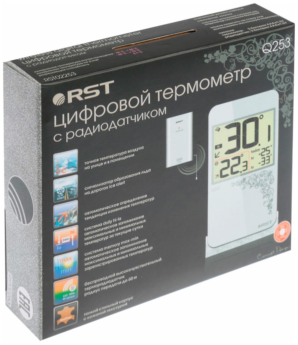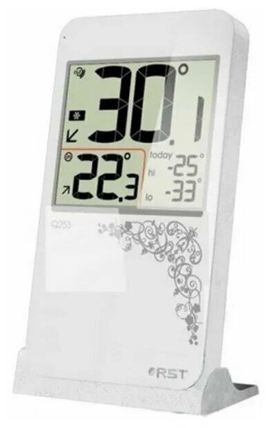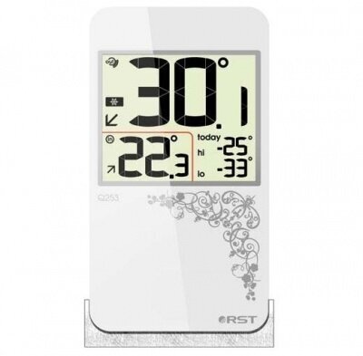 Компактный цифровой термометр с радиодатчиком RST показывает тенденцию изменения температурных показаний в понятном для пользователя графическом виде на монохромном числовом дисплее, позволяет сохранить предельные значения. Представленный термометр выглядит просто и лаконично благодаря современному дизайну, размещается на горизонтальной поверхности внутри жилого помещения, можно на пол.