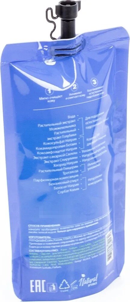 | Химический состав | aqua with infusion of: Vaccinium Angustifolium (Bluberry) Fruit Extract (экстракт Голубики), Juniperus Communis (Juniper) Extract(экстракт Можжевельника), Sodium Coco Sulfate, Cocamidopropyl Betaine (из Кокосового масла), Sodium Cocoamphoacetate, Vegetable Glycerin (растительного происхождения), Betaine natural extract (экстракт сахарной Свеклы), Spirulina Platensis Extract (экстракт Спирулины), Trehalose, Sodium Chloride, Parfume, Benzyl Alcohol, Benzoic Acid, Dehydroacetic Acid, Sodium Benzoate, Potassium Sorbate, Citric Acid, Linalool |