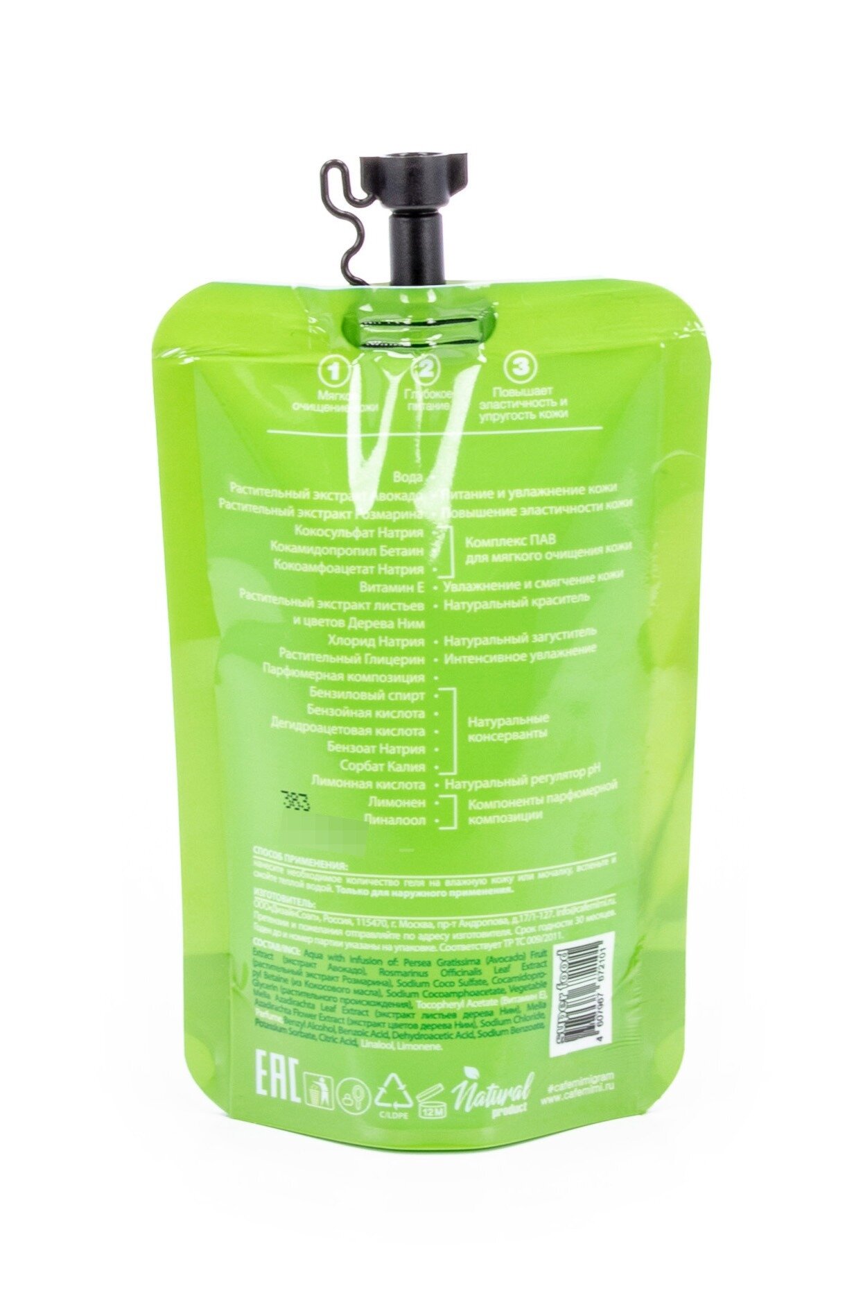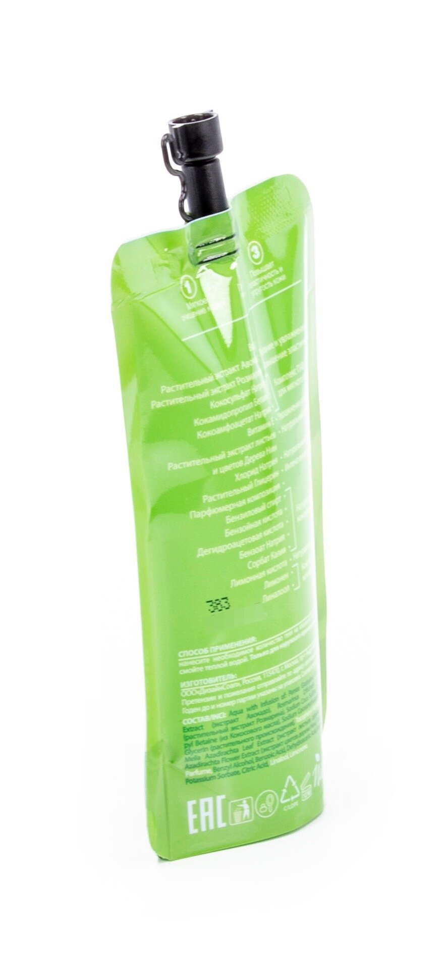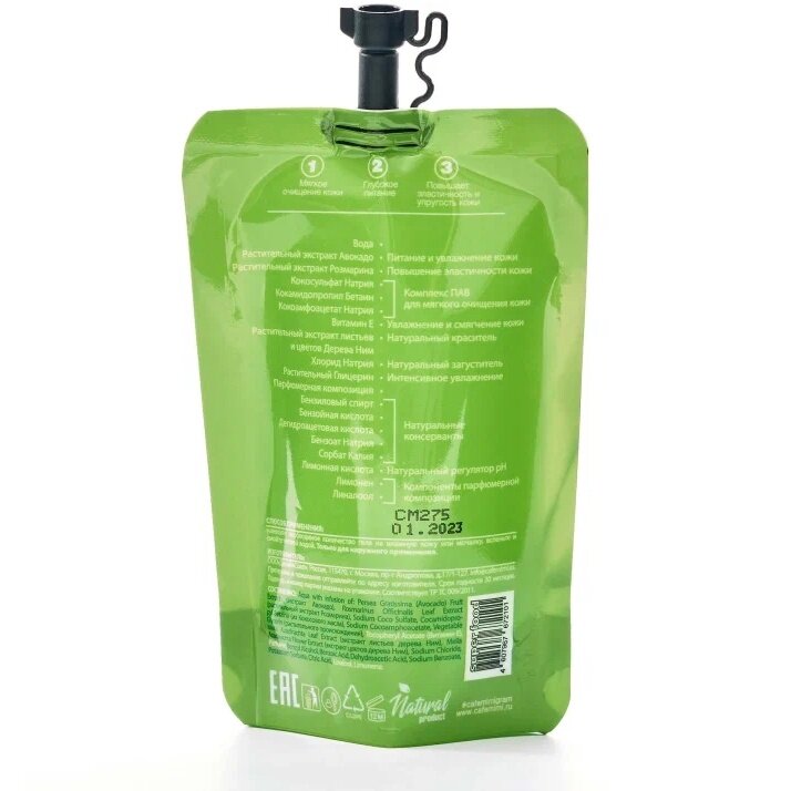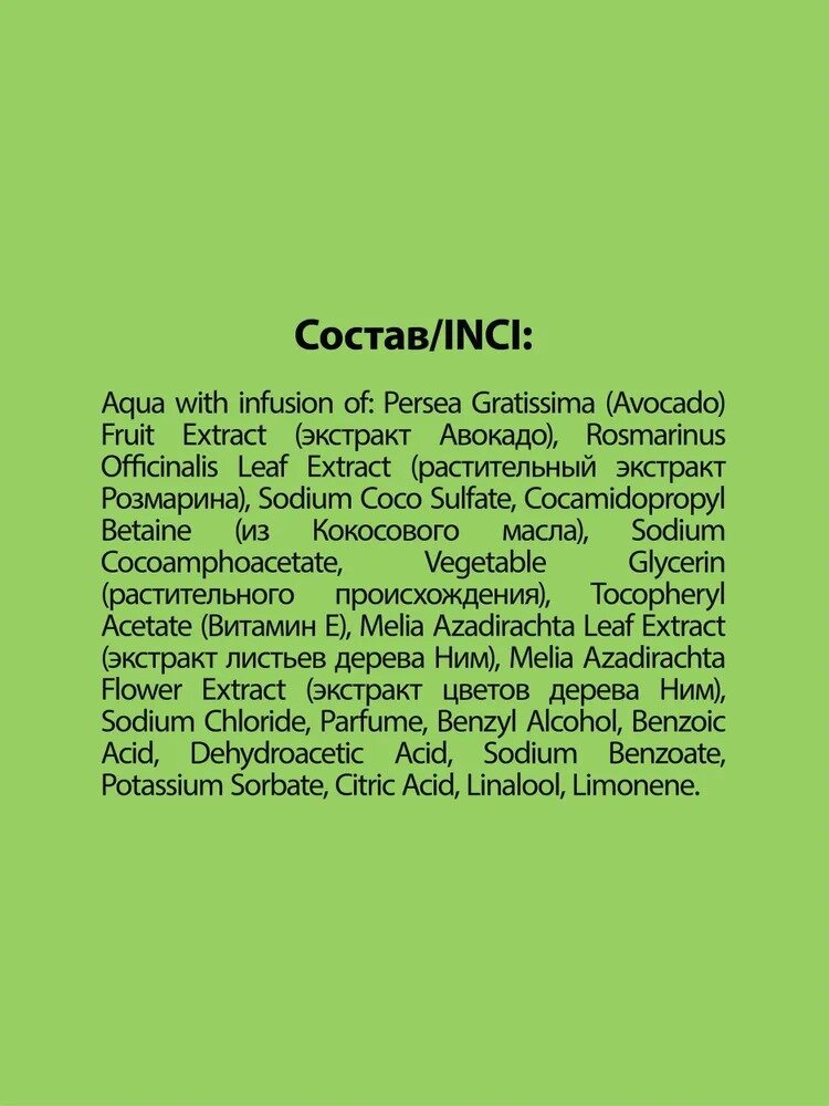 | Химический состав | Aqua with infusion of: Persea Gratissima (Avocado) Fruit Extract (экстракт Авокадо), Rosmarinus Officinalis Leaf Extract (экстракт Розмарина), Sodium Coco Sulfate, Cocamidopropyl Betaine (из Кокосового масла), Sodium Cocoamphoacetate, Vegetable Glycerin (растительного происхождения), Tocopheryl Acetate (Витамин Е), Melia Azadirachta Leaf Extract (экстракт листьев дерева Ним), Melia Azadirachta Flower Extract (экстракт цветов дерева Ним), Sodium Chloride, Parfume, Benzyl Alcohol, Benzoic Acid, Dehydroacetic Acid, Sodium Benzoate, Potassium Sorbate, Citric Acid, Linalool, Limonene. |