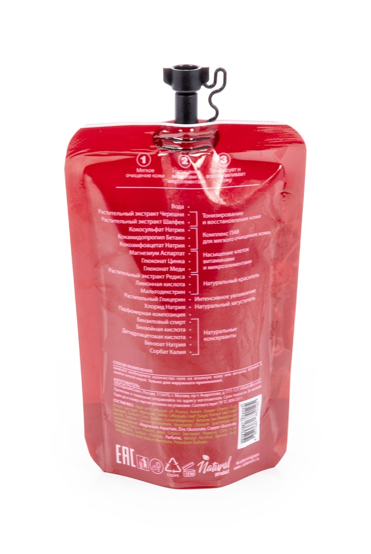| Химический состав | Aqua with infusion of: Prunus Avium (Sweet Cherry) Fruit Extract (экстракт Черешни), Salvia Officinalis Leaf (Sage) Extract (экстракт Шалфея), Sodium Coco Sulfate, Cocamidopropyl Betaine (из Кокосового масла), Sodium Cocoamphoacetate, Vegetable Glycerin (растительного происхождения), Magnesium Aspartate, Zinc Gluconate, Copper Gluconate, Raphanus Sativus (Radish) Root Extract (экстракт Редиса), Citric Acid, Maltodextrin, Sodium Chloride, Parfume, Benzyl Alcohol, Benzoic Acid, Dehydroacetic Acid, Sodium Benzoate, Potassium Sorbate. |