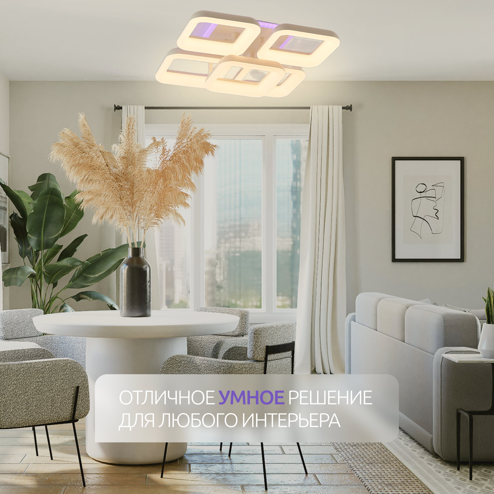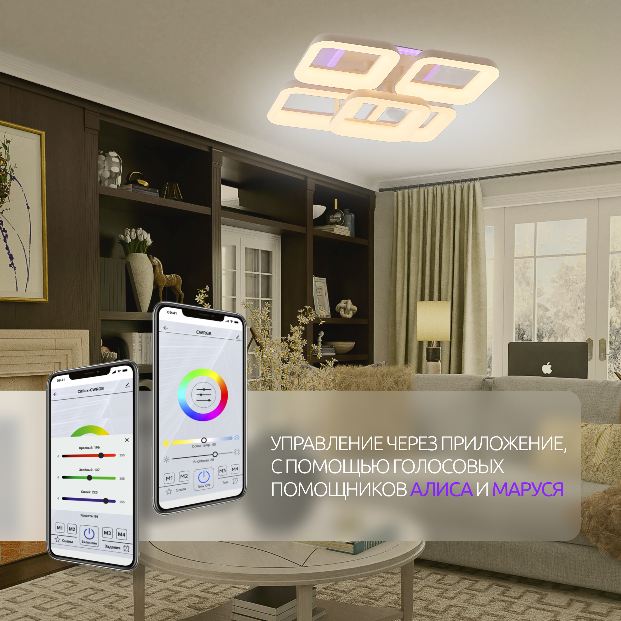 | Дополнительные характеристики | можно управлятьиз приложения на смартфоне по Wi-Fi при наличии интернета, с помощью голосовых помощников Алиса и Маруся, есть возможность запуска настроенных сценариев с помощью Сири, а также пультом дистанционного управления и с настенного выключателя; в основании светильника установлена независимая цветная подсветка RGB.; пульт ДУ с батарейками (тип ААА) в комплекте |