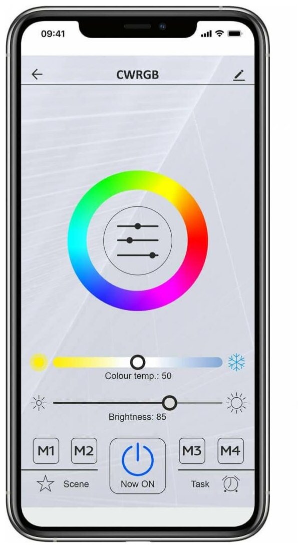 | Дополнительные характеристики | доступна плавная регулировка яркости от 100 до 10%; плавная регулировка цветовой температурой освещения в диапазоне от 3000К до 5500К, позволяет настроить любые оттенки теплого, нейтрального или холодного света; цветная RGB подсветка имеет различные режимы работы; таймер - функция отсроченного на 20сек. выключения; четыре кнопки памяти позволяют сохранить настроенные режимы работы и включать их с пульта или обычным настенным выключателем |