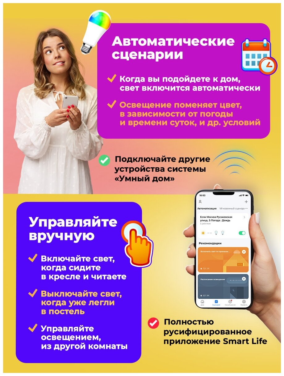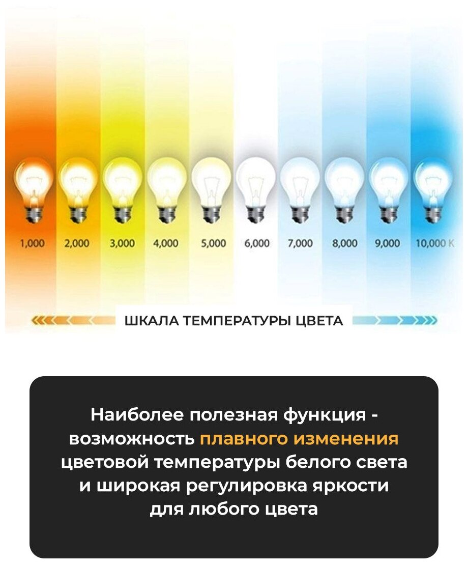 Полезной особенностью «умной лампочки» Ritmix SLА-1077-Tuya является возможность плавного изменения цветовой температуры белого света и широкая регулировка яркости для любого цвета.