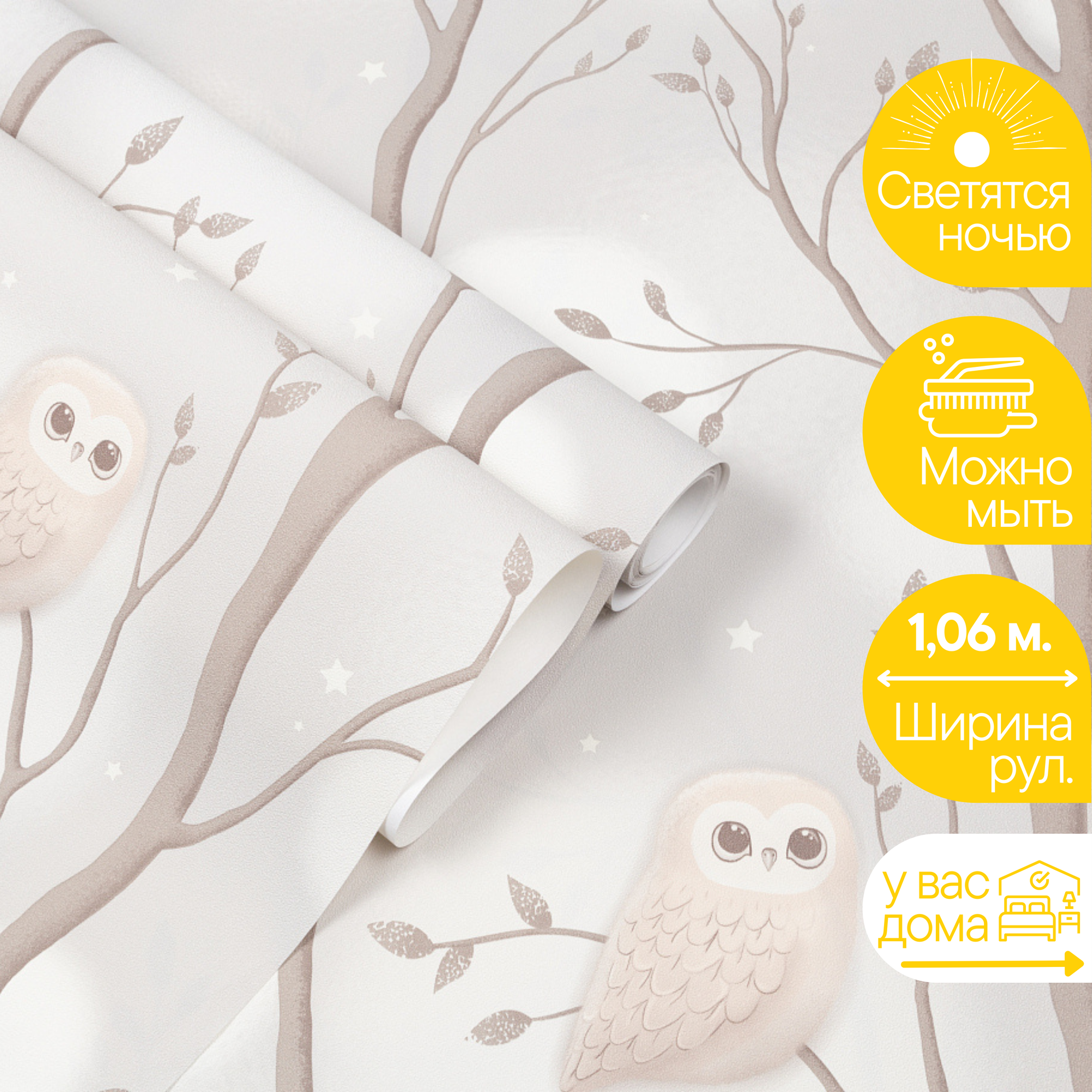 Обои имеют рапорт 0 см и не требуют стыковки рисунка.Обои, в рамках одного заказа, всегда поставляются только одной партии, и не имеют разных оттенков!Коллекция обоев Wonderful перенесет в атмосферу сказочных фантазий. В них вас ожидают чудесные прогулки в волшебном лесу с очаровательными совами арт. 71534 или удивительные приключения на вымышленном дирижабле арт. 71535. Рисунок симпатичных сов и сказочных дирижаблей рельефно выделяется на гладкой поверхности обоев. Его приятно рассматривать и гладить руками.Сбалансированная цветовая гамма коллекции создает особую загадочную атмосферу, а светящиеся в темноте звезды органично дополняют интерьер магическим очарованием. Коллекция чудесно впишется в детскую комнату или спальню.Сказочный рисунок органично дополнит звездный фон арт. 71536. Светящиеся в темноте звезды будут волшебно смотреться на стенах, а при размещении на потолке превратят его в необыкновенное звездное небо. Для тех, у кого дети в душе и наяву.Виниловое покрытие (в технике горячего тиснения) придает обоям высокую устойчивость к мытью и механическим воздействиям.Основные свойства:- сдерживают микротрещины стен, на которые наклеены;