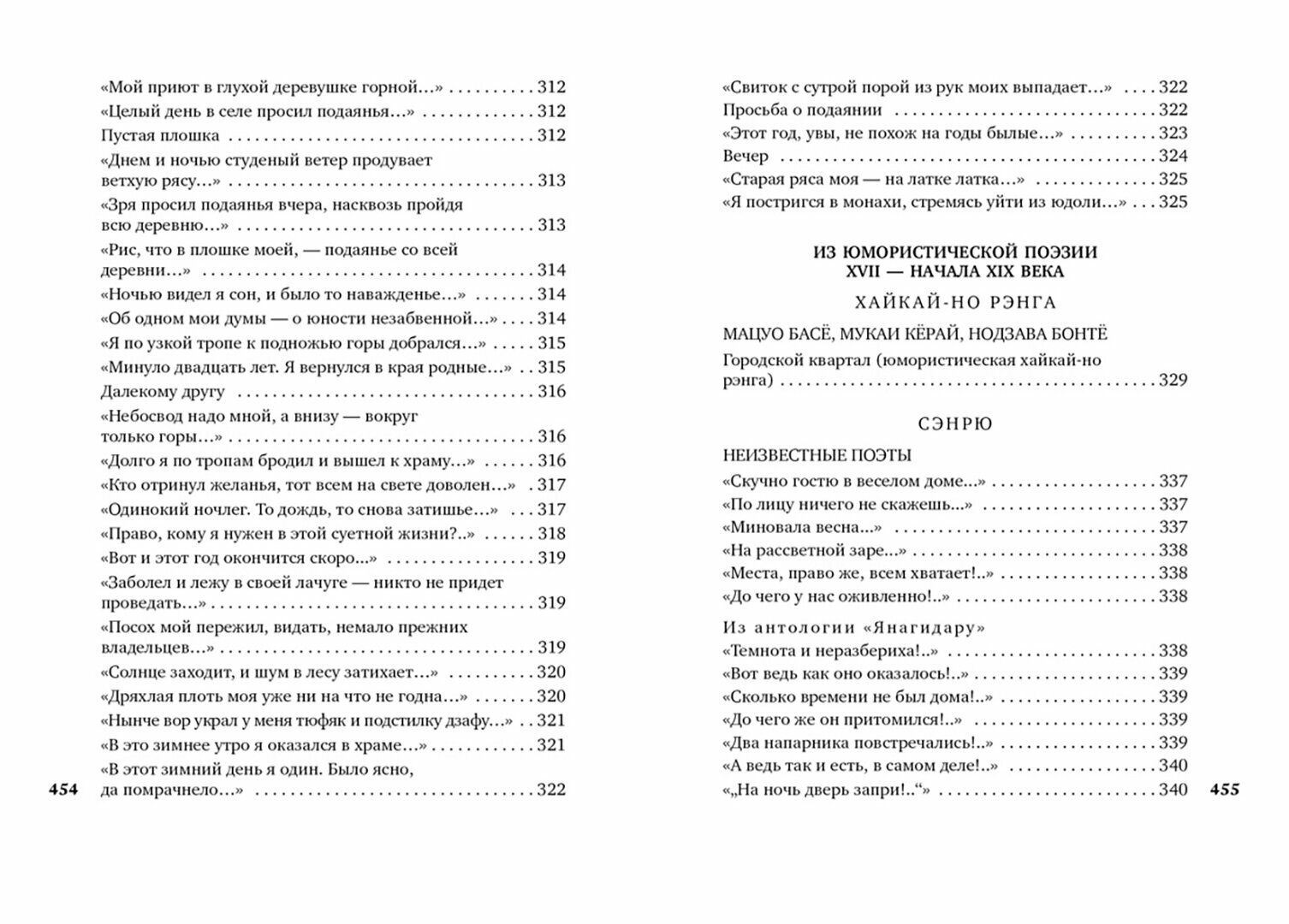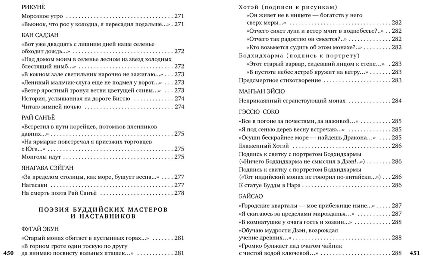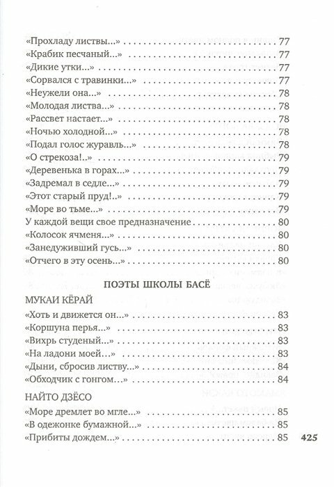 В сборнике представлена богатая палитра поэтических жанров: философские и пейзажные трехстишия хайку, утонченные пятистишия вака (танка ), образцы лирической и дидактической поэзии на китайском канси , а также стихи дзэнских мастеров и наставников, в которых тонкость эстетического мироощущения сочетается с эмоциональной напряженностью непрестанного самопознания. Ценным дополнением к шедеврам классиков служат подборки юмористической поэзии (сэнрю, кёка, хайкай-но рэнга), а также переводы фольклорных песен-коута, сложенных обитательницами «веселых кварталов».