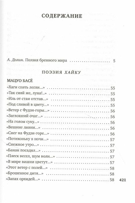 В антологию, подготовленную известным востоковедом и переводчиком японской поэзии Александром Долиным, включены классические шедевры знаменитых поэтов позднего Средневековья (XVII – начала XIX в.). Наряду с такими популярными именами, как Мацуо Басё, Ёса-но Бусон, Кобаяси Исса, Мацунага Тэйтоку, Ихара Сайкаку, Камо Мабути, Одзава Роан Рай Санъё или инок Рёкан, читатель найдет в книге немало новых авторов, чьи творения украшают золотой фонд японской и мировой литературы.