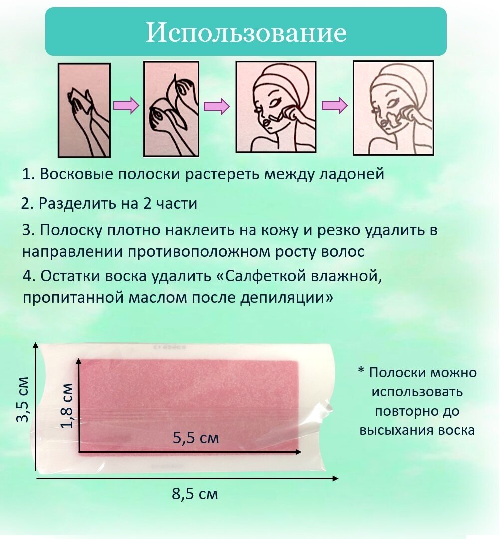 Восковые полоски предназначены для быстрого удаления нежелательных волос на лице и других деликатных частях тела с особо чувствительной кожей. Воск хорошо прилегает к коже и удаляет даже самые короткие и тонкие волоски вместе с луковицей. Ваша кожа после депиляции долгое время остается гладкой и шелковистой.