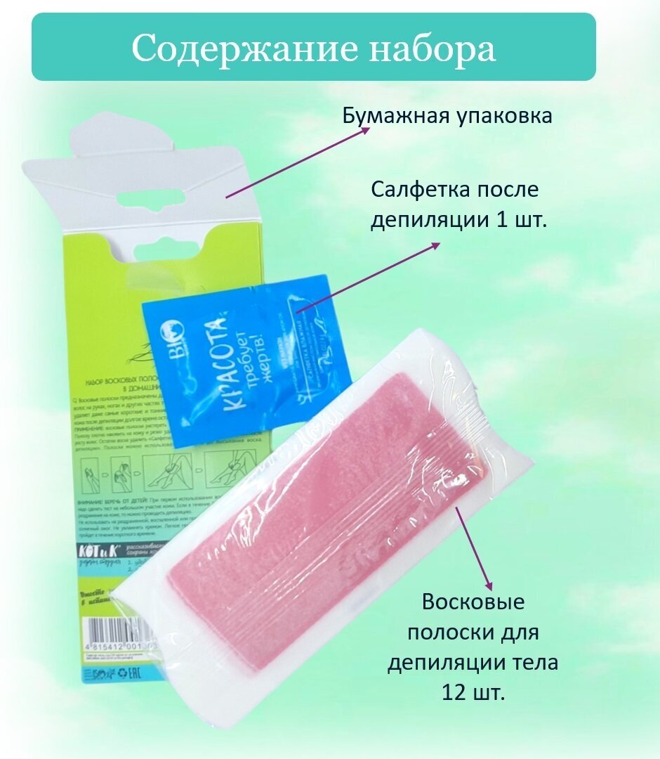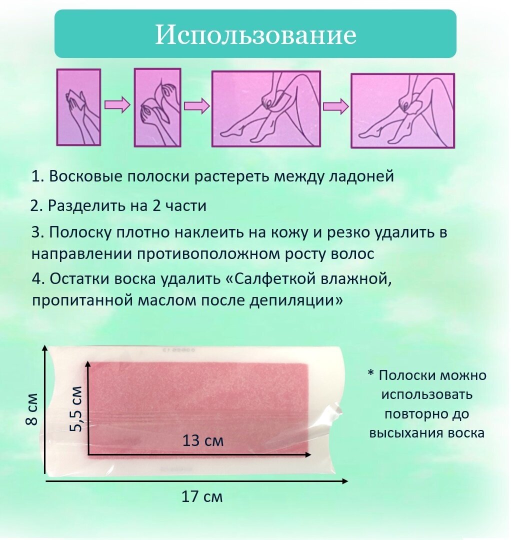 Восковые полоски предназначены для быстрого удаления нежелательных волос на теле. Воск хорошо прилегает к коже и удаляет даже самые короткие и тонкие волоски вместе с луковицей. Ваша кожа после депиляции долгое время остается гладкой и шелковистой. Упаковка может отличаться по цвету.