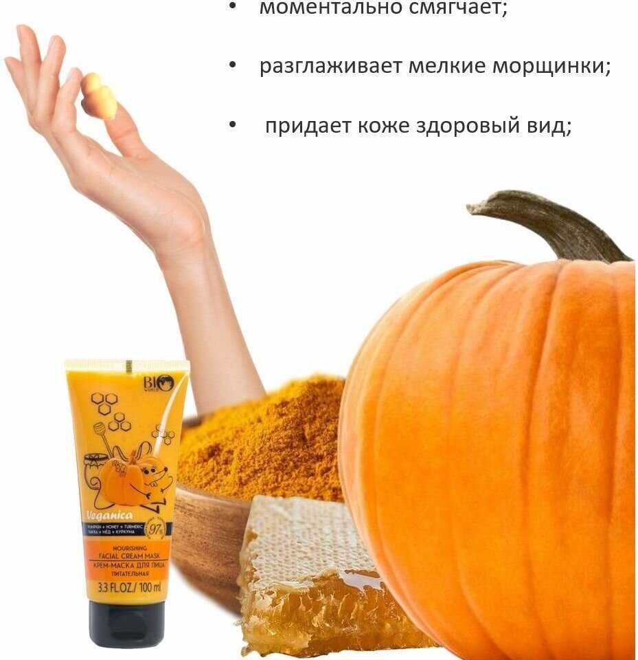 Тыква + мед + куркума. Питательная крем-маска для интенсивного ухода и улучшения состояния кожи лица и зоны декольте. Моментально смягчает, разглаживает мелкие морщинки и придает ухоженный вид. Тыква – витаминная "бомба" с высокой концентрацией витаминов А, В, Е, РР, антиоксидантов, цинка и каротина. Замедляют процессы старения кожи, улучшают выработку коллагена и эластина. Мед питает, смягчает, дезинфицирует, насыщает кожу кислородом. Куркума – женская пряность с осветляющим и успокаивающим кожу эффектом. Не наносите на кожу вокруг глаз! Используйте 2 раза в неделю. При попадании в глаза промыть.
