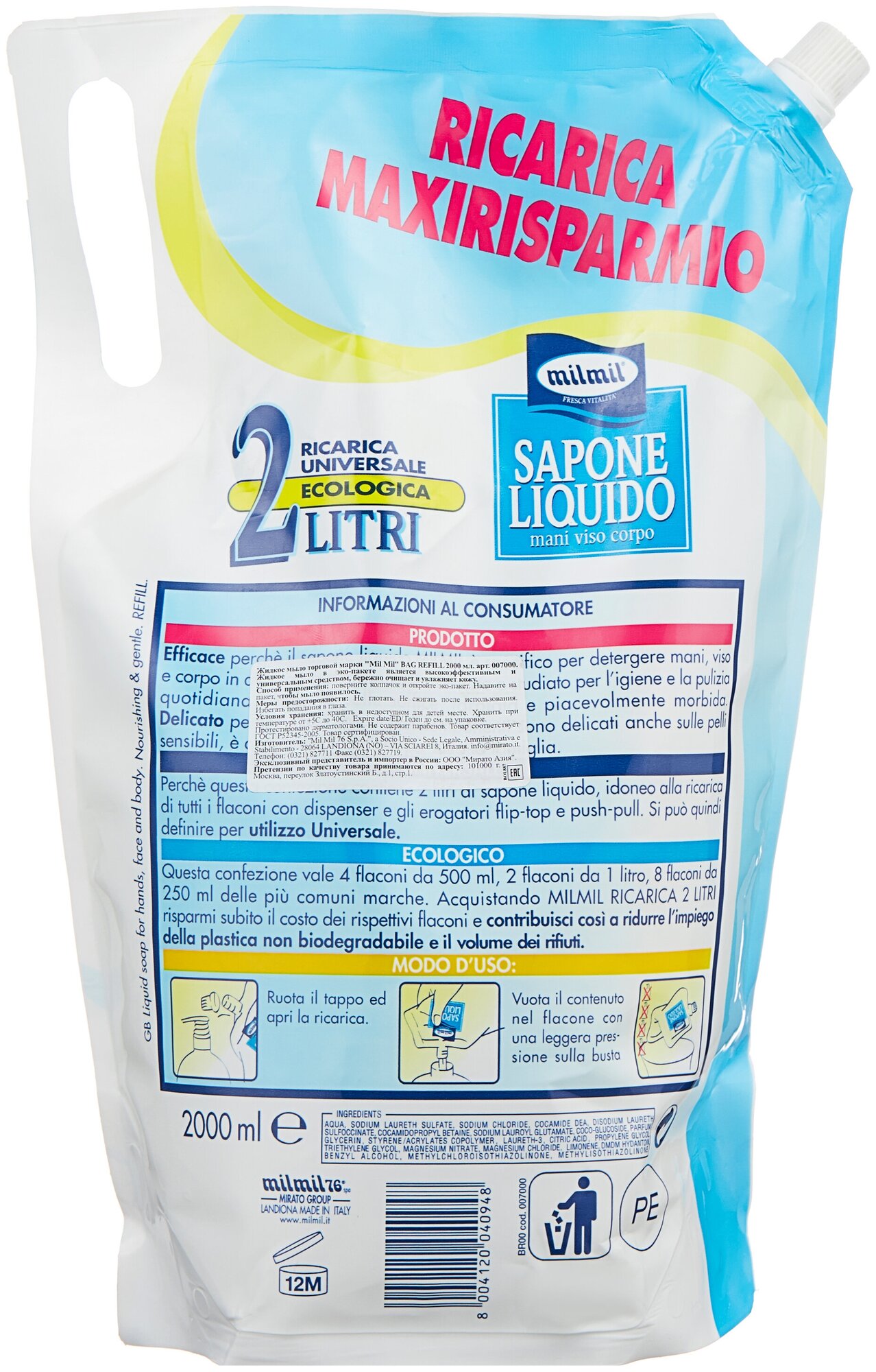 Жидкое мыло Milmil предназначено для очищения рук, лица и тела в качестве альтернативы мылу. Разработанный и изученный для ежедневной гигиены и очистки, он делает кожу мягкой, увлажненной и приятно мягкой. Его избранные компоненты также мягко воздействуют на чувствительную кожу, что делает его идеальным для использования всей семьей. Мыло универсально, потому что эта упаковка содержит 2 литра жидкого мыла, подходящего для повторного наполнения всех бутылок с дозатором, а также дозатором флип-топ и двухтактным. Эта упаковка стоит 4 бутылки по 500 мл, 2 бутылки по 1 литру, 8 бутылок по 250 мл самых распространенных марок. Приобретая MILMIL REFILL 2 LITERS, вы сразу экономите на стоимости соответствующих бутылок и, таким образом, способствуете сокращению использования небиоразлагаемого пластика и объема отходов.
