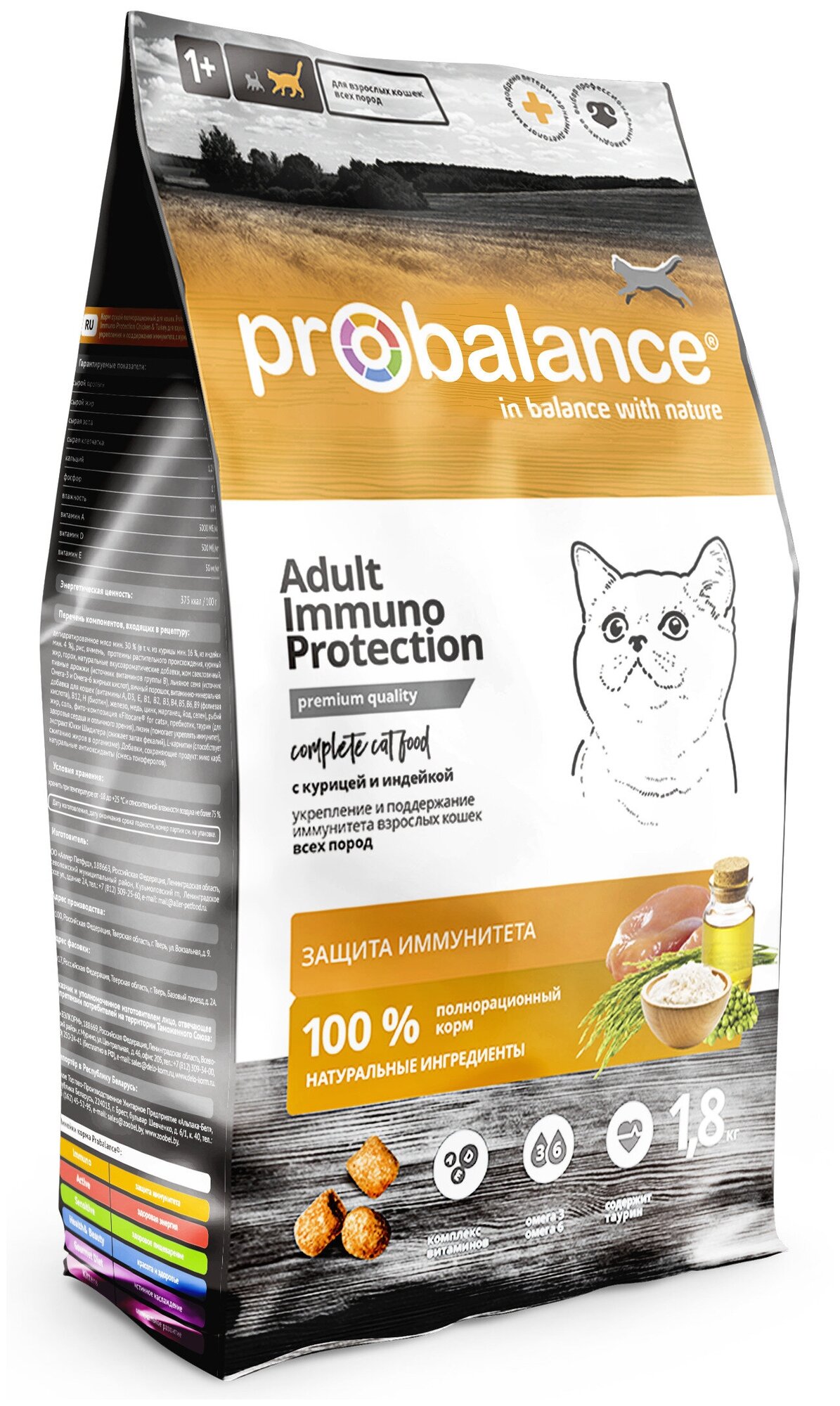 Полнорационный сбалансированный сухой корм премиум класса для кошек с функцией защиты и укрепления иммунитета. Корм рекомендован для ежедневного кормления взрослых кошек всех пород. Рецептура корма разработана ветеринарами из Дании. Главный компонент корма – сразу несколько видов мяса, незаменимый источник белка животного происхождения. Для поддержания и укрепления иммунитета корм обогащен целым рядом функциональных компонентов: • Жирные кислоты Омега-3 и Омега-6 увеличивают сопротивляемость организма, отвечают за красоту шерсти и кожи. • Сбалансированный витаминно-минеральный комплекс ежедневно пополняет организм кошки необходимыми микроэлементами. • Природные антиоксиданты и лизин способствуют укреплению иммунитета. Глюкозамин и хондроитин помогают сохранить суставы здоровыми. • Пребиотик обеспечивает правильную работу кишечника и поддержание баланса микрофлоры, быстрое усвоение без нагрузки на систему пищеварения. • Таурин укрепляет зрение и сердечную мышцу. Оптимальный баланс питательных и минеральных веществ предотвращает возникновение заболеваний опорно-двигательного аппарата. В корм включена фито-композиция из целебных трав и ягод, которая обладает общеукрепляющими и тонизирующими свойствами. Probalance – натуральный рацион на каждый день, баланс вкуса и пользы. В корм входят продукты от проверенных поставщиков без Е-консервантов. Размер гранулы: диаметр – 7 мм, толщина – 9 мм, форма – бочонок.