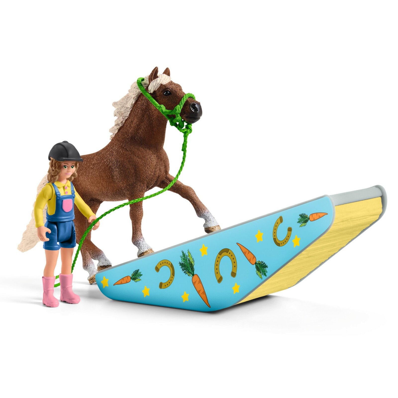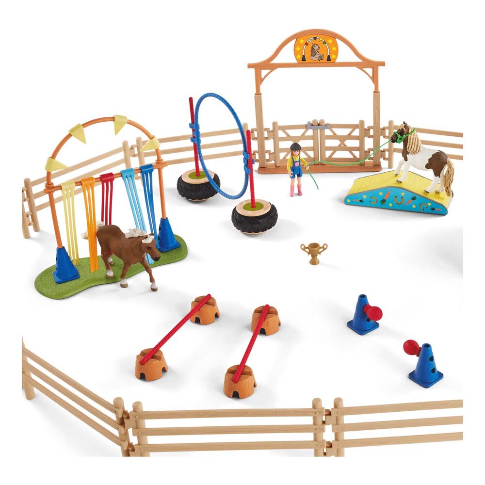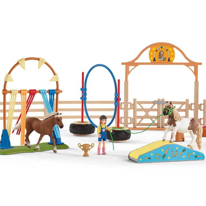 Набор Schleich Прыжки в конюшне предлагает захватывающую полосу препятствий, включая стойло, загоны и большие входные ворота! Можно бросить вызов другим лошадям на особенно большом тренировочном поле. На трассе есть большое кольцо для прыжков и качели, требующие равновесия. Другие элементы также можно комбинировать на ваше усмотрение. Попытаются ли Шетлендские пони преодолеть препятствие? Мустанг Маре уже с интересом наблюдает из своего стойла.