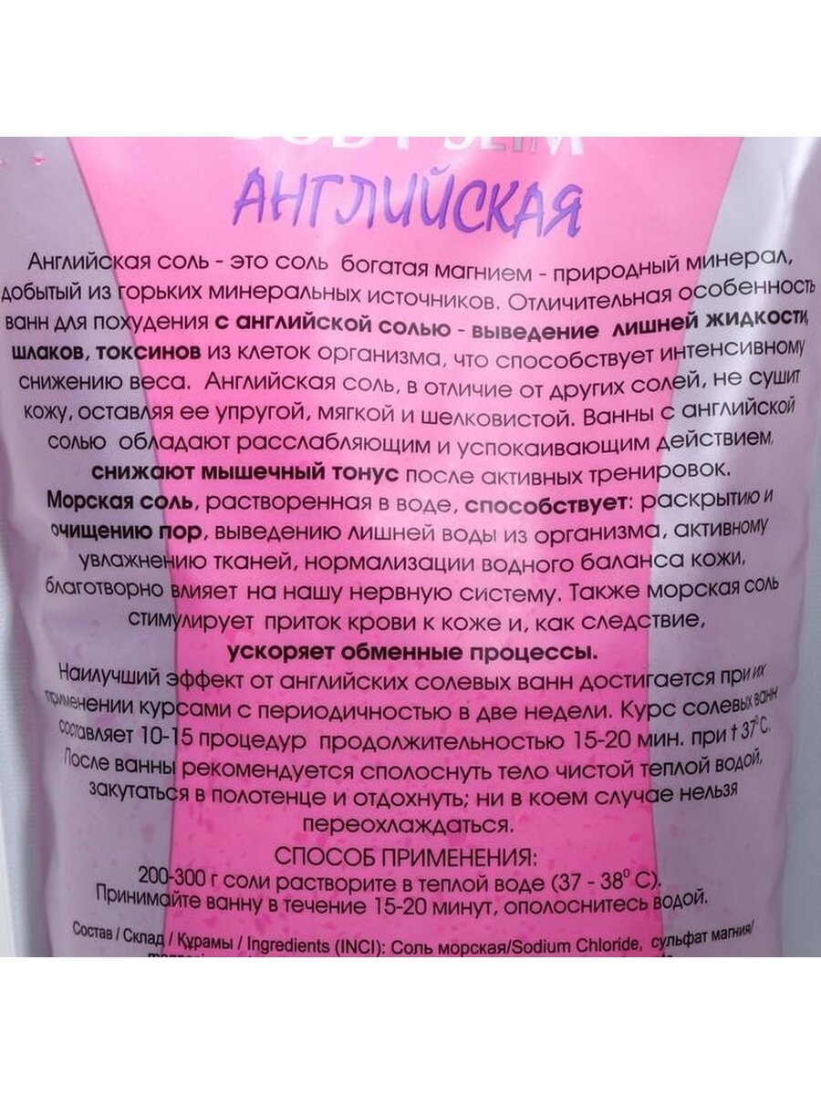 Английская соль - это соль, богатая магнием - природный минерал, добытый из горьких минеральных источников. Отличительная особенность ванн для похудения с английской солью - выведение лишней жидкости, шлаков, токсинов из клеток организма, что способствует интенсивному снижению веса. Английская соль, в отличие от других солей, не сушит кожу, оставляя ее упругой, мягкой и шелковистой. Ванны с английской солью обладают расслабляющим и успокаивающим действием, снижают мышечный тонус после активных тренировок.