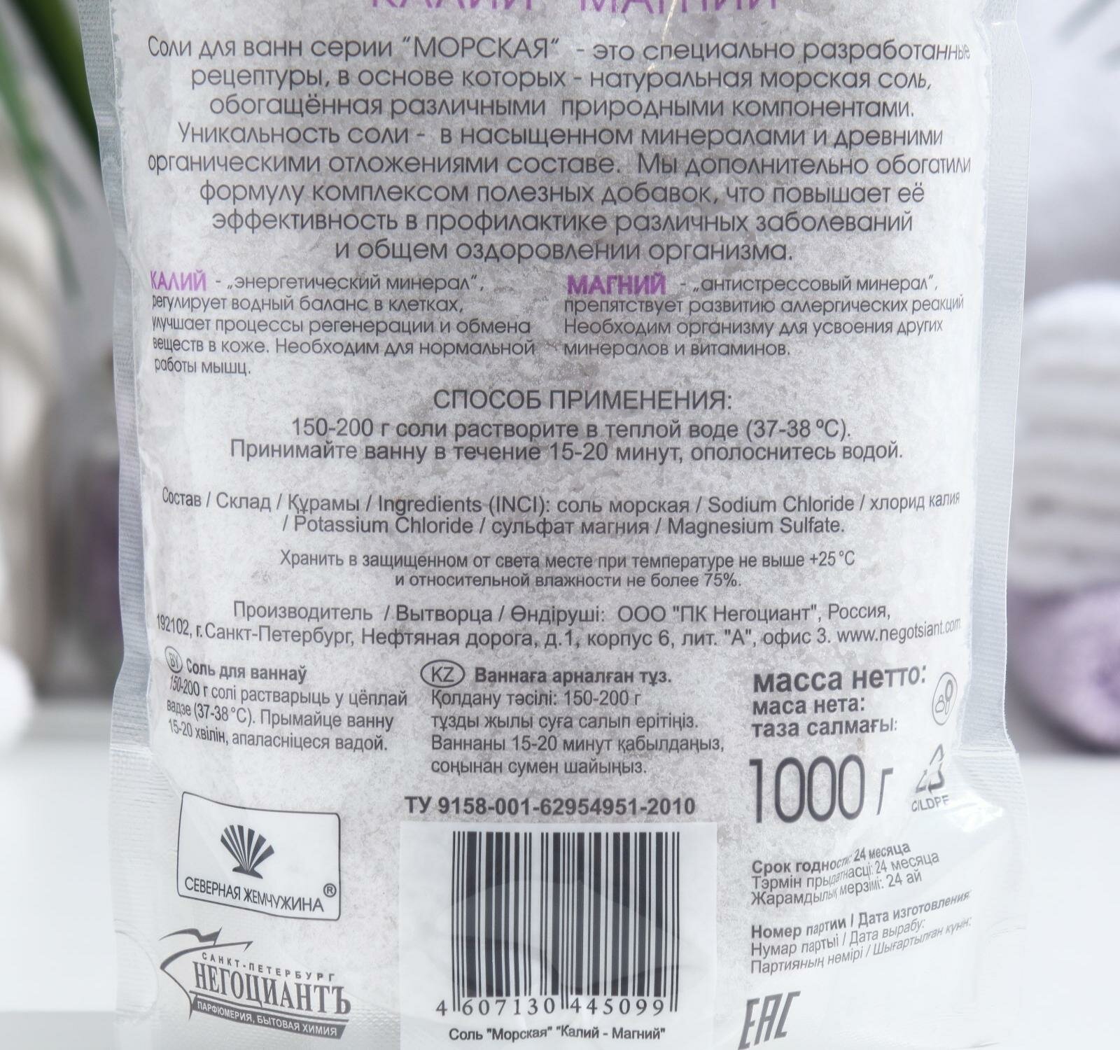 | Полное наименование | Соль для ванн МОРСКАЯ калий-магний 1кг |