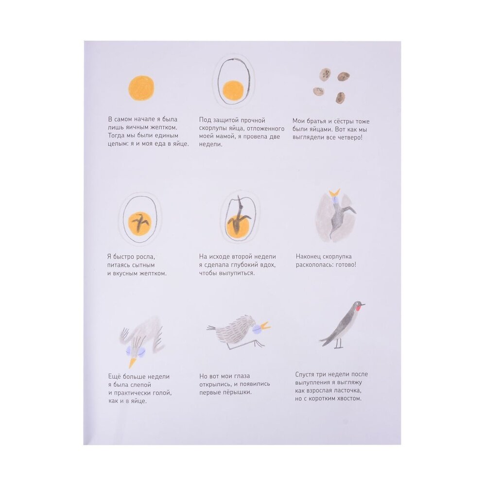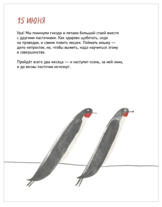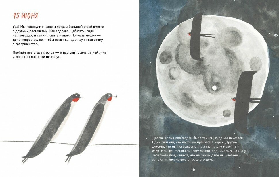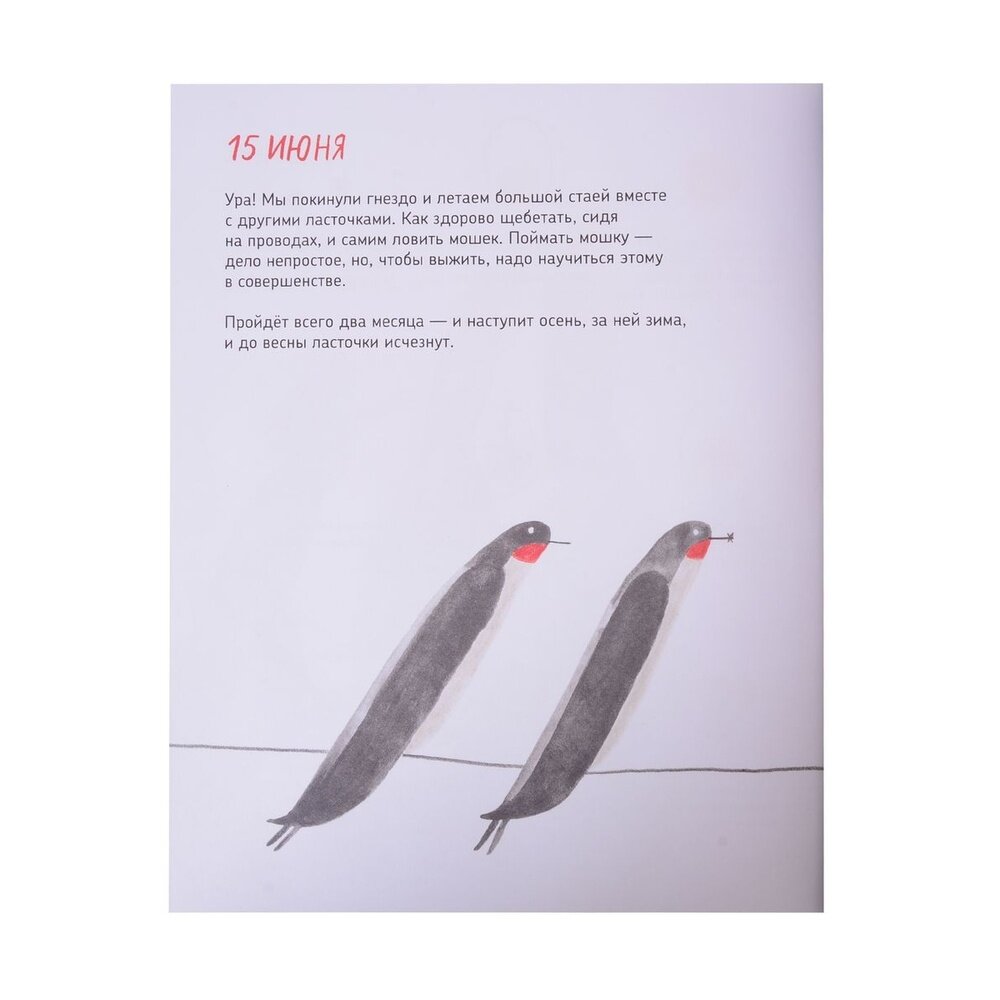 Из книги мы с детьми узнали в короткой и доступной форме о жизни ласточки круглый год - где и как она рождается, куда улетает на зиму, что ее ждёт на долгом пути, какие у неё есть разные перья. Книга будет интересна и маленьким детям, и школьникам и даже взрослым. Она одновременно простая и понятная, и емкая, кроме того автор Квартальнов Павел орнитолог, кандидат биологических наук и поэтому за достоверность информации быть уверенным. Иллюстрации мне тоже очень нравятся, интересные, современные, понятные