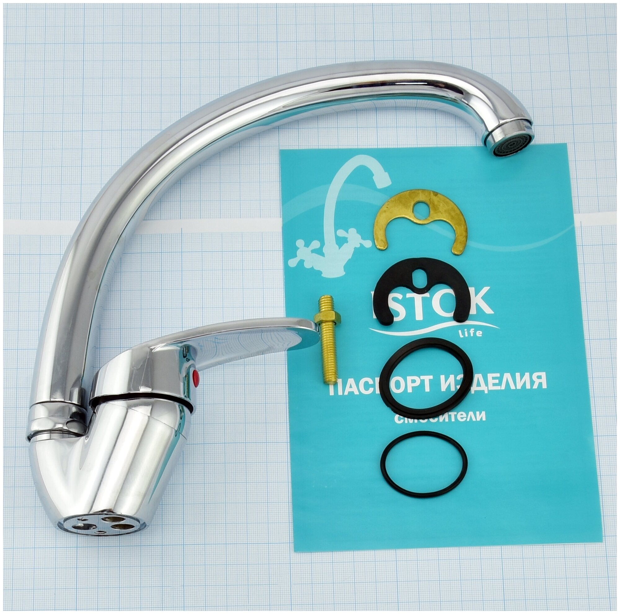 Смеситель для кухни ISTOK life рычажный серии Standard, Кухонный смеситель (кран) предназначен для использования в городских квартирах или частных домах, имеет современный дизайн и изготовлен из материалов и комплектующих, отвечающих современным стандартам качества. Данная модель представляет собой надежный и современный смеситель с горизонтальным способом установки, устанавливается на мойку или столешницу, толщиной не более 35 мм. Тип крепления – шпилька. Смеситель имеет поворотный излив (гусак), длина которого 170 мм, эко-сеточка аэратора выполнена из долговечного ABS-пластика, насыщает воду кислородом, и позволяет уменьшить ее расход. Стильный, современный корпус смесителя выполнен из прочного сплава алюминия с кремнием с хромированным покрытием. Регулировать температуру воды и выбирать оптимальный напор струи удобно посредством ручки - рычага. Запорный механизм смесителя - керамический картридж 35 мм в корпусе из экологичного АВС-пластика, который не выделяет вредных веществ под воздействием высоких температур. Все элементы конструкции смесителя устойчивы к коррозии, износу и механическим повреждениям, что продлевает период использования изделия. Хромированное гипоаллергенное покрытие не раздражает кожу. В коллекции Standard представлены модели не только для кухни, но также для умывальника (раковины), ванны и душа, душевых кабин. С вниманием и заботой о покупателе мы производим огромное разнообразие смесителей, что позволит Вам составить комплект в едином стиле. Все наши смесители идеально впишутся в любой интерьер Вашей ванной комнаты или кухни. Основное преимущество наших смесителей – наилучшее соотношение цены и качества. Гарантия от производителя на корпус и комплектующие 1 год. В комплекте нет подводки! Условия ухода за смесителем, для длительной службы хромированного покрытия, описаны в паспорте, вложенном в упаковку. Комплектация: смеситель – 1 шт., крепежный комплект – 1 шт. (шпилька), паспорт (с гарантийным талоном) – 1 шт., упаковка – 1 шт.