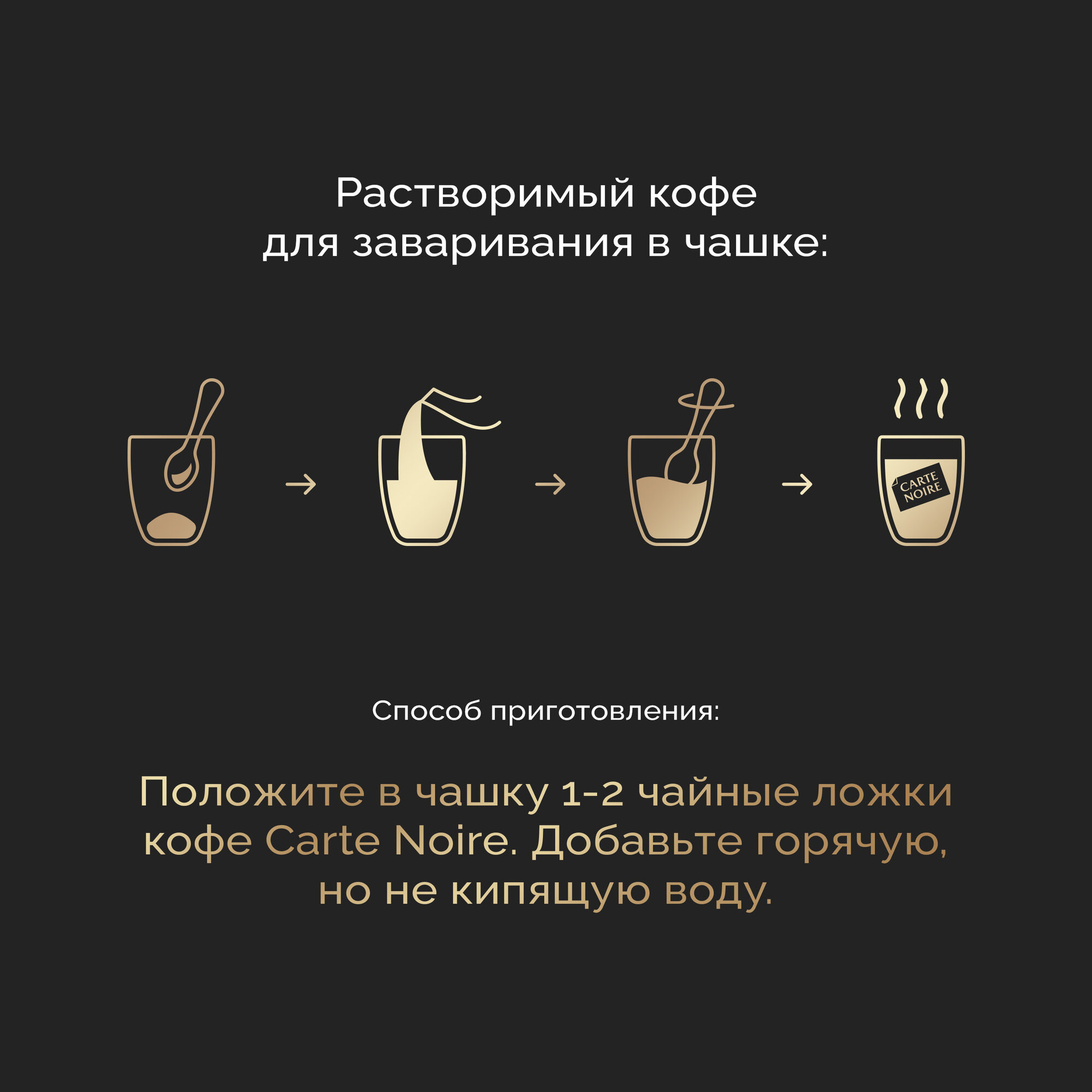 Кофе CARTE NOIRE имеет прекрасный, классический вкус кофе. Нет горчинки, перебора с крепостью, пьешь и наслаждаешься. Очент ароматный. Несмотря на то, что кофе просто заливаешь кипятком, а не варишь, запах на кухне сохраняется еще долго. Кстати, в жаркую погоду делаю холодный кофе и он прекрасно растворяется и в прохладной воде не оставаясь песчинками ни в чашке ни во рту.