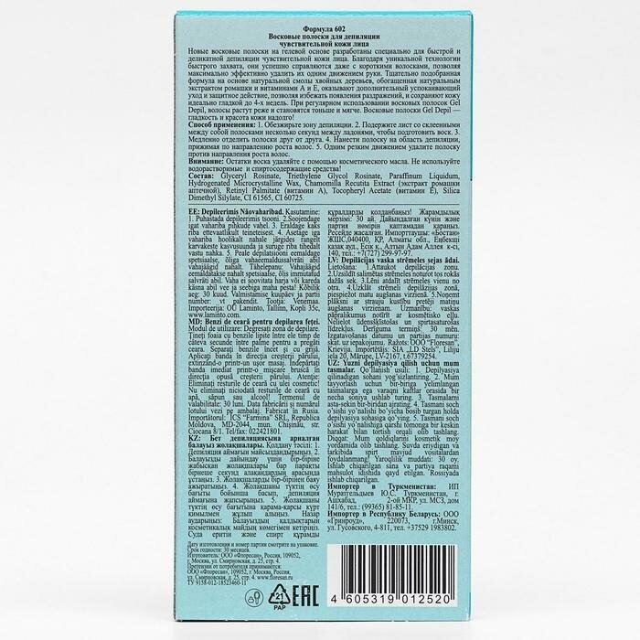 | Способ применения | 1. для лучшего прилегания воска, перед процедурой удаления волос необходимо обезжирить предполагаемый участок депиляции. Для этого протрите зону депиляции любым спиртосодержащим лосьоном. 2. Возьмите лист со склеенными между собой полосками. Расположите его между ладонями, нагрейте полоски в течение 25-30 сек. 3. Разъедините склеенные между собой полоски и наклейте их на кожу, разглаживая по направлению роста волос. 4. Одним резким движением удалите полоску против направления роста волос. 5. После полного удаления волос на всей области депиляции, удалите остатки воска с помощью косметического масла и нанесите крем-гель после депиляции, который успокаивает, увлажняет кожу, и способствует замедлению роста волос. Внимание |