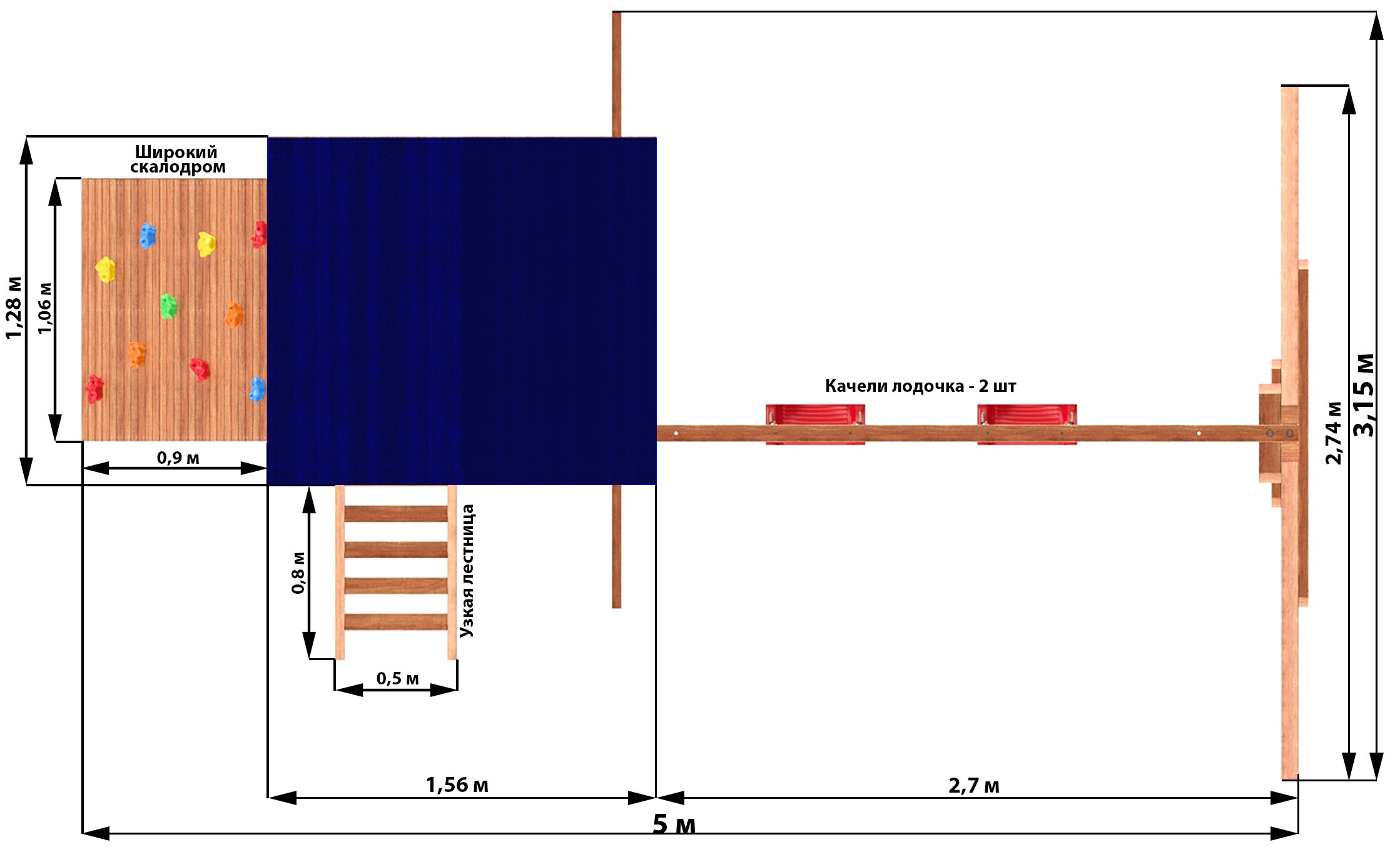 | Комплектация | крыша деревянная; песочница; скалодром с зацепами; подвесные качели; лестница с ручками |