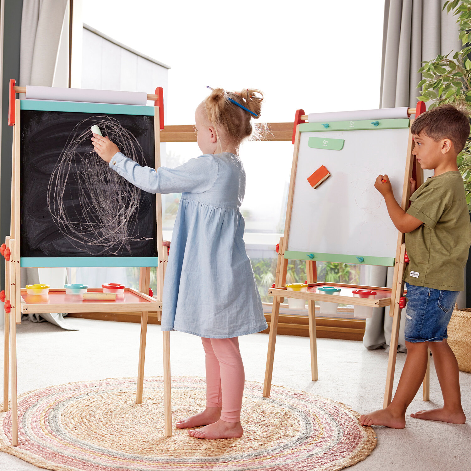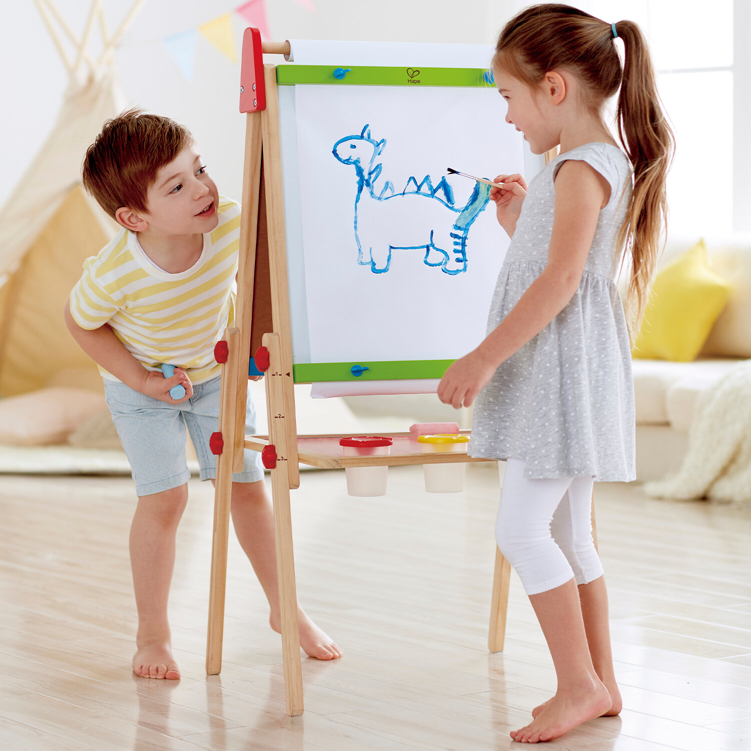 • Рекомендуется для мальчиков и девочек от 1 года. • Магнитный мольберт ALL-IN-1 - идеальная игрушка для детей и детей, подходящая для детей от 3 лет и старше. • Деревянный мольберт позволяет вашему малышу рисовать, писать или рисовать мелом, что делает его идеальным чистым холстом для творчества. • Двухсторонний мольберт оснащен магнитной доской с одной стороны, на которую дети могут прикрепить магниты или нарисовать картинку. • Классическая доска, которая идеально подходят для рисования, раскрашивания, игры в школу. • Мольберт поставляется с бумажным рулоном, который позволяет вашему ребенку рисовать на нем картины. • Мольберт регулируется по высоте, подходящий для детей разного возраста и роста • Подставка может регулироваться от 95 до 110,5 см. • Мольберт изготовлен из качественной древесины, окрашен краской на водной основе. • Подставка для бумаги оснащена специальными винтовыми зажимами, чтобы надежно фиксировать рисунки. • Детский набор для рисования поставляется с удобными баночками для краски. Баночки имеют разноцветные крышки, для удобной кодировки. • Баночки для краски надежно фиксируются в специальных отверстиях полки. • Мольберт легко собирается, что удобного хранения. • Этот детский мольберт позволяет детям развивать свое творчество. • Идеально подходит для творческого время препровождения. • Продукт удостоен наград Oppenheim Toy Portfolio Gold Seal Award for 2014. • Игрушка изготовлена из безопасных для детей и прочных материалов, гарантирующих, что это игрушка, которую ваш ребенок будет любить долгие годы. • Игрушка прошла контроль на безопасность и качество. Один из крупнейших в мире производителей игрушек. Hape руководствуется философией, что будущее принадлежит нашим детям, и создает игрушки, которые вдохновляют на игру и изучение мира, в котором мы живем. Все продукты соответствуют строгим международным стандартам качества и безопасности. Hape - новое поколение игрушек.