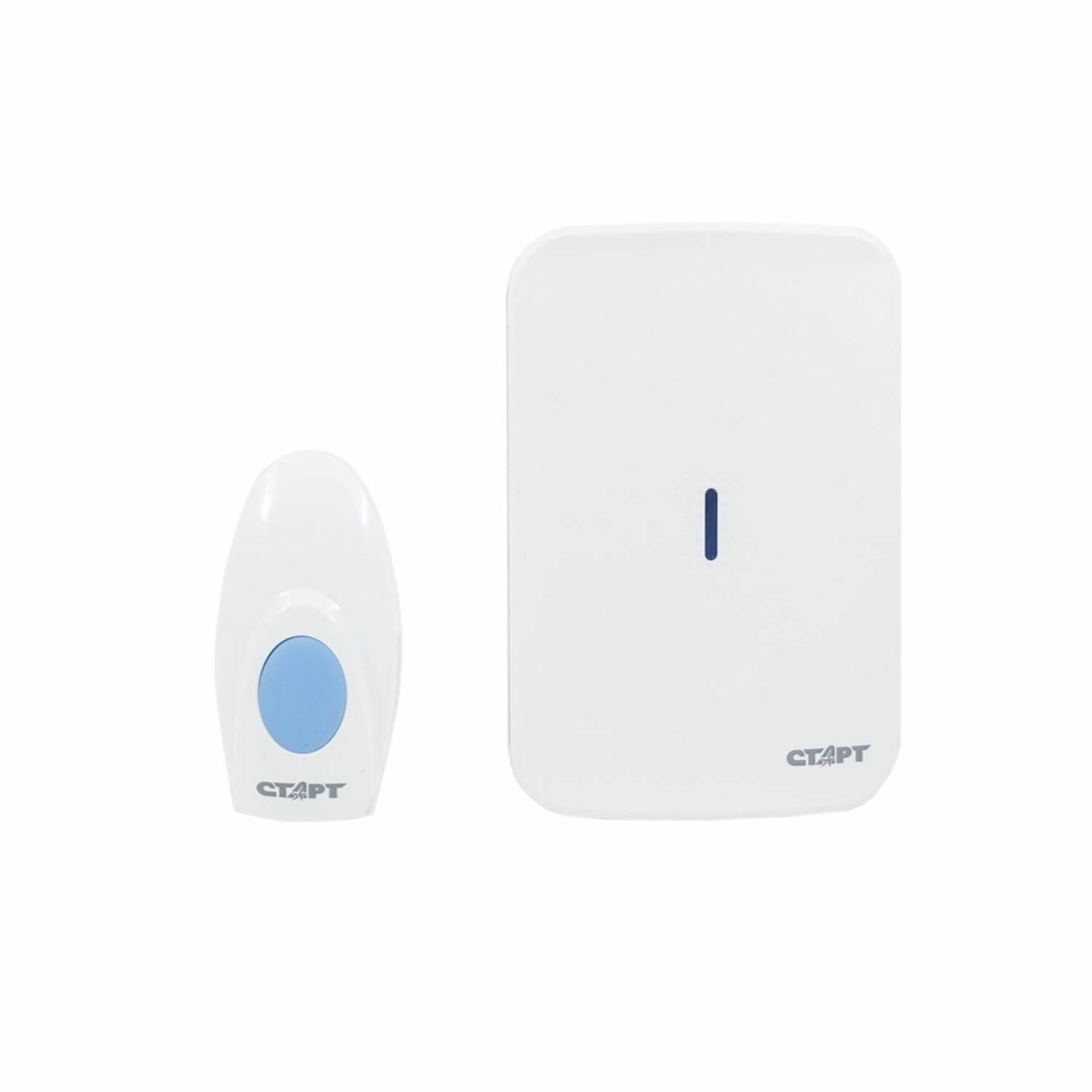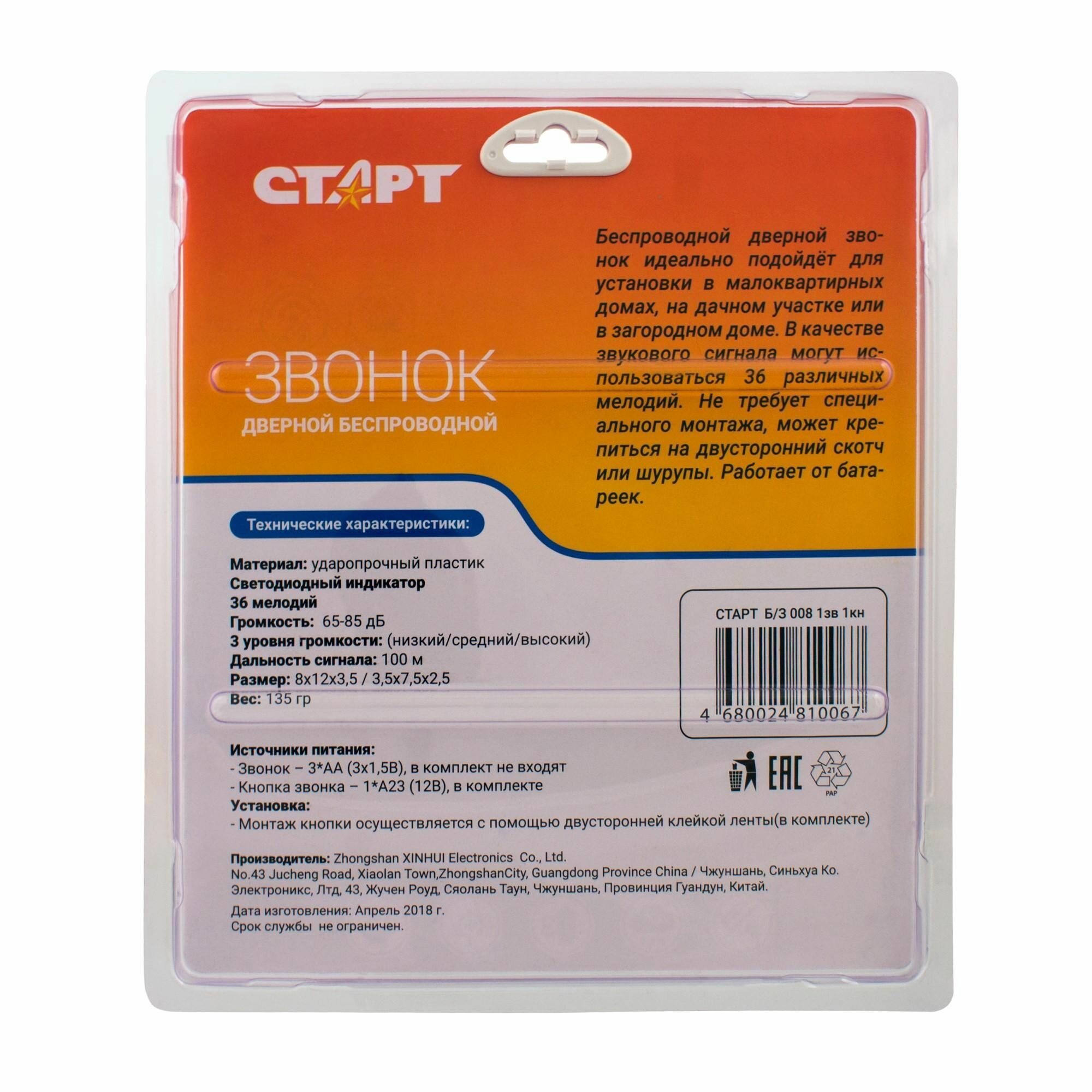 Беспроводной звонок старт применяется в качестве звукового оповещения на входе в квартиру или закрытое офисное помещение, при отсутствии возможности для установки стационарного звонка с монтажом внутренней проводки. Выполнен в современном виде с модными декоративными элементами.Компактный электроприбор будет удобен для размещения не только в квартирах, но и на дачных участках или частных домов, где расстояние до входных ворот не превышает максимальной дистанции действия прибора по открытым пространстванм - 80 метров. При нажатии на кнопку вызова включается декоративная подсветка. Регулировка громкости звонка позволяет выбрать один из трех режимов, находящихся в пределах от 65 до 85дБ. Слышимость мелодий четкая.Кнопка вызова защищена от влаги, что позволяет устанавливать ее не только в помещения, но и на улице. Контактная схема рассчитана на работу при низких температурах. Корпуса прибора и ответной части выполнены из крепкого пластика.Крепление приборов осуществляется на поставляемый в комплекте двухсторонний скотч. Для надежного и долговечного удержания приборов на вертикальной поверхности ее рекомендуется обезжирить перед установкой.Питание звонка осуществляется посредством трех батарей типоразмера АА. Кнопка вызова комплектуется батарейкой типоразмера А23. Для подбора комфортного звучания вызова, прибор оснащен 36-ю мелодиями в разнообразных музыкальных стилях.