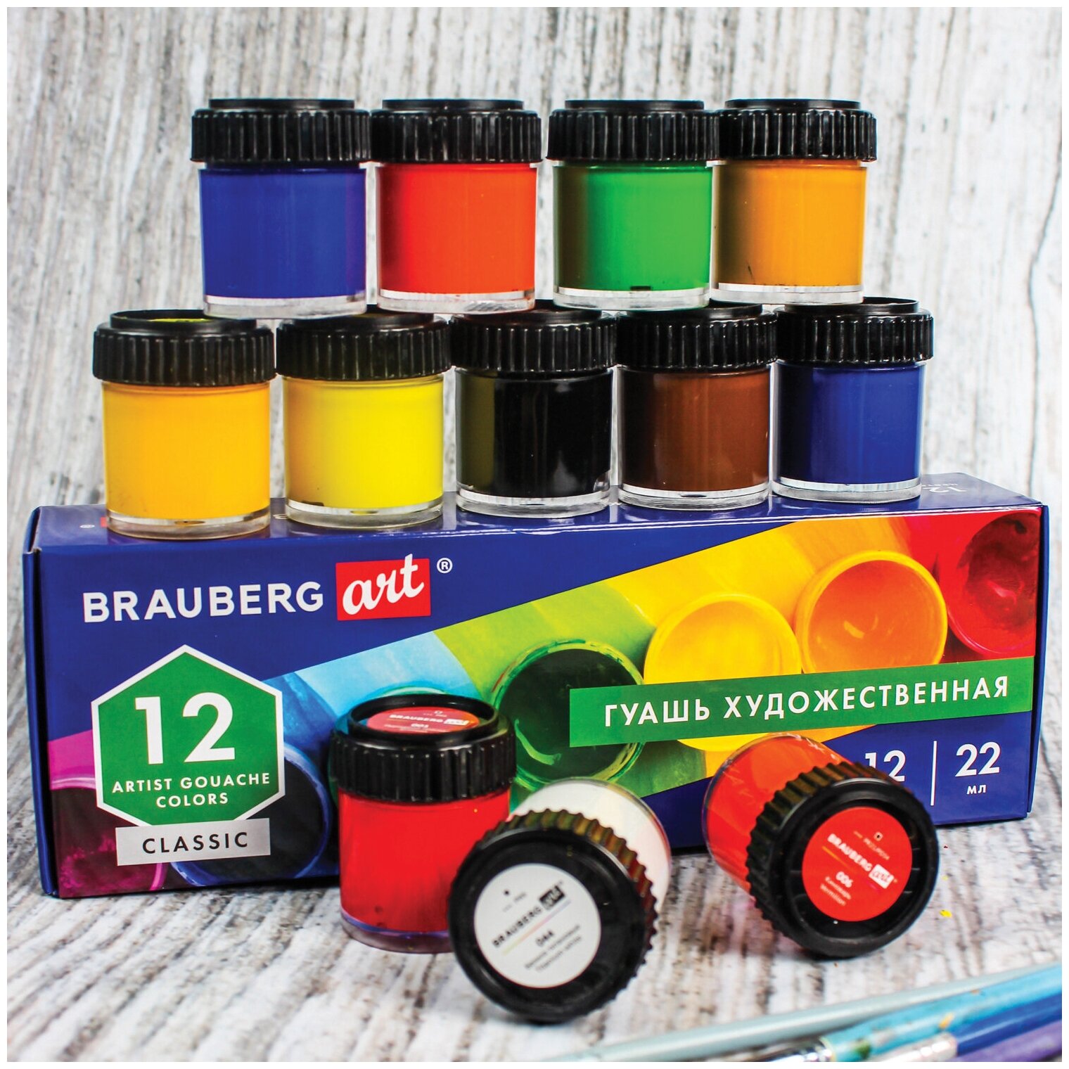 Краски гуашь 12 шт./12 цветов 22 мл банка картонная коробка BRAUBERG CLASSIC (191585) Гуашь художественная Art Classic 12 цветов 191585