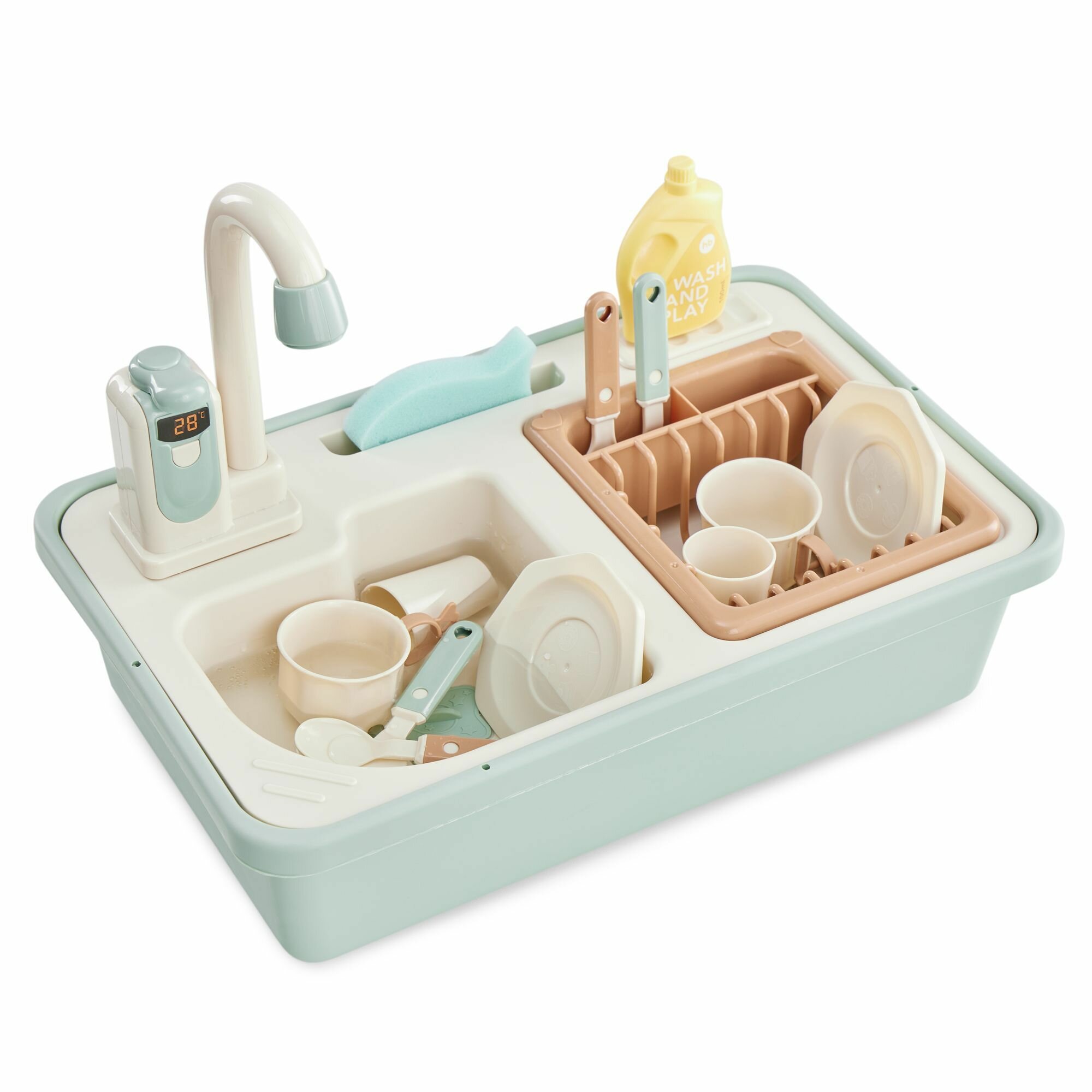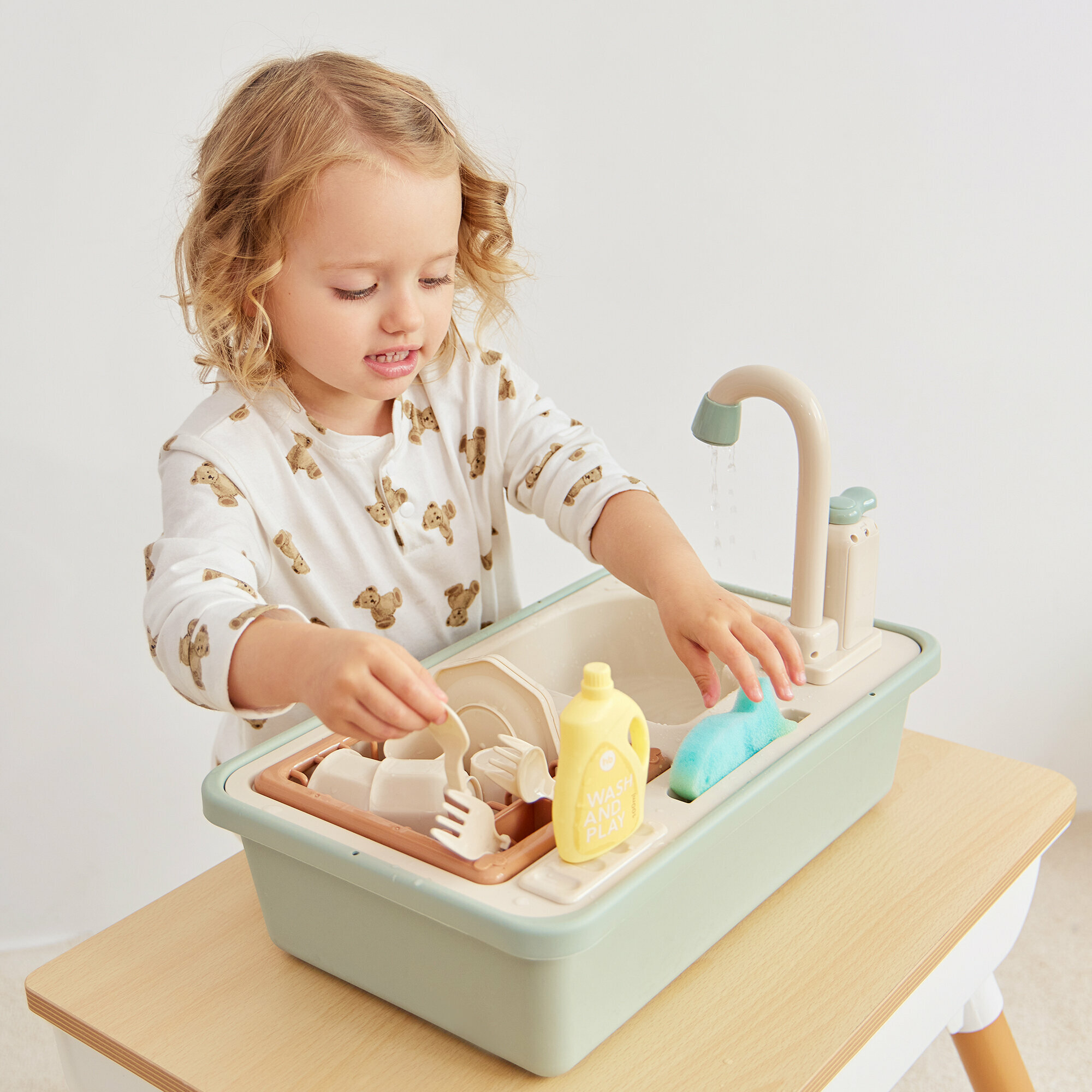 Вода в игрушке циркулирует. Наполните мойку водой, включите кран – вода начнёт вытекать через него обратно в мойку, а затем снова попадёт в кран. Играть можно бесконечно. Приятные эмоции обеспечены.