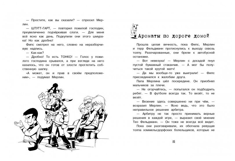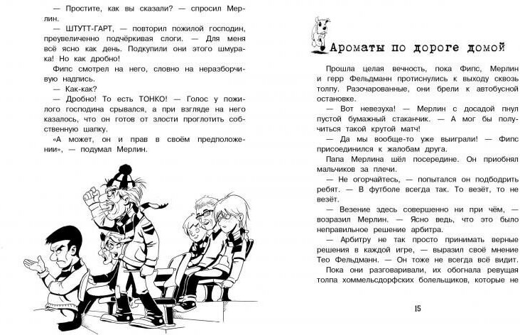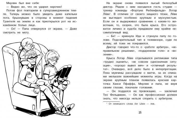На мой вкус эта самая слабая книга из всей серии. Дети расследуют дело о том, почему арбитр подсудил одной из команд. Предполагаю, что детям играющим в футбол понравится, но мой сын откровенно скучал. Сплошные термины, итальянская мафия, отец хулиганистого мальчика из школы - всё в кучу. Иллюстраций практически нет. Из плюсов: небольшой формат (удобно брать в дорогу), плотность бумаги, крупный шрифт.