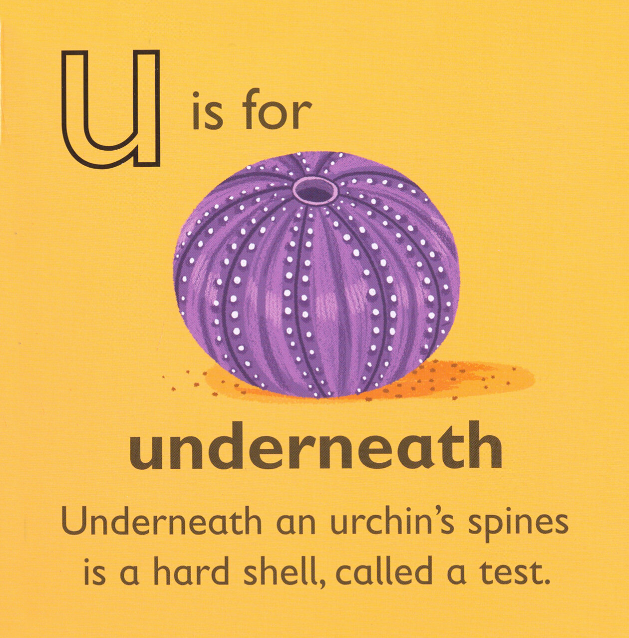 U is for underneath! Did you know that underneath an urchin's spine is a hard shell called a test? Packed with bright pictures and short text, this engaging animal book provides curious children with lots to talk about and look at!